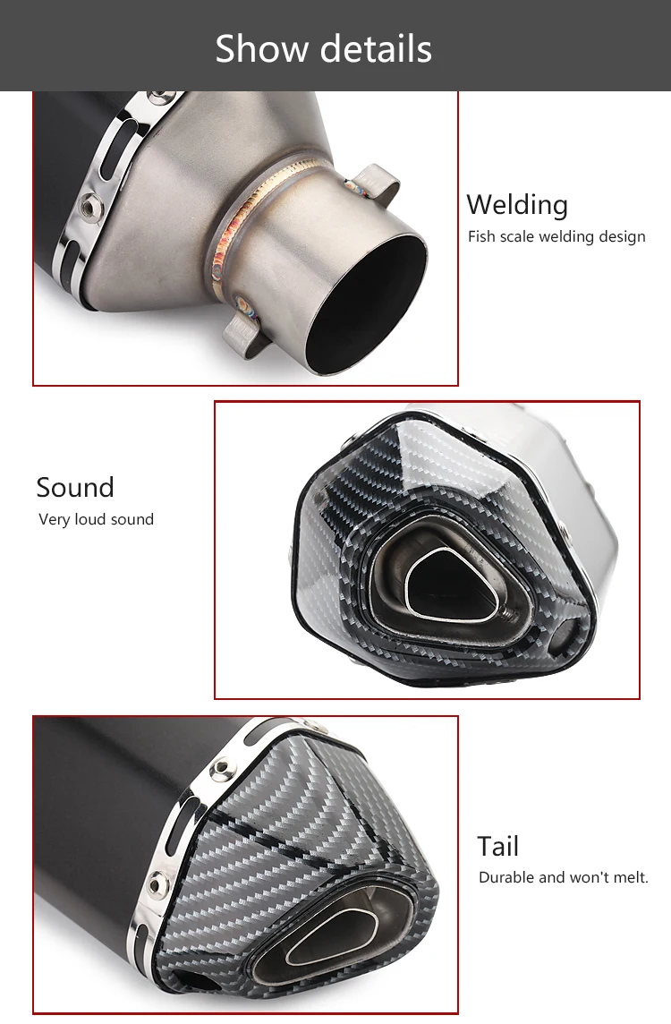Это универсальная Модифицированная выхлопная труба мотоцикла, она подходит для моделей мотоциклов калибра 51 мм (с адаптером 36-51 мм). Этот продукт был изготовлен из высококачественной нержавеющей стали и Украшен узором из углеродного волокна. Отличное качество изготовления и хорошая текстура. Для очень немногих моделей установка может потребовать простой сварки и сборки.