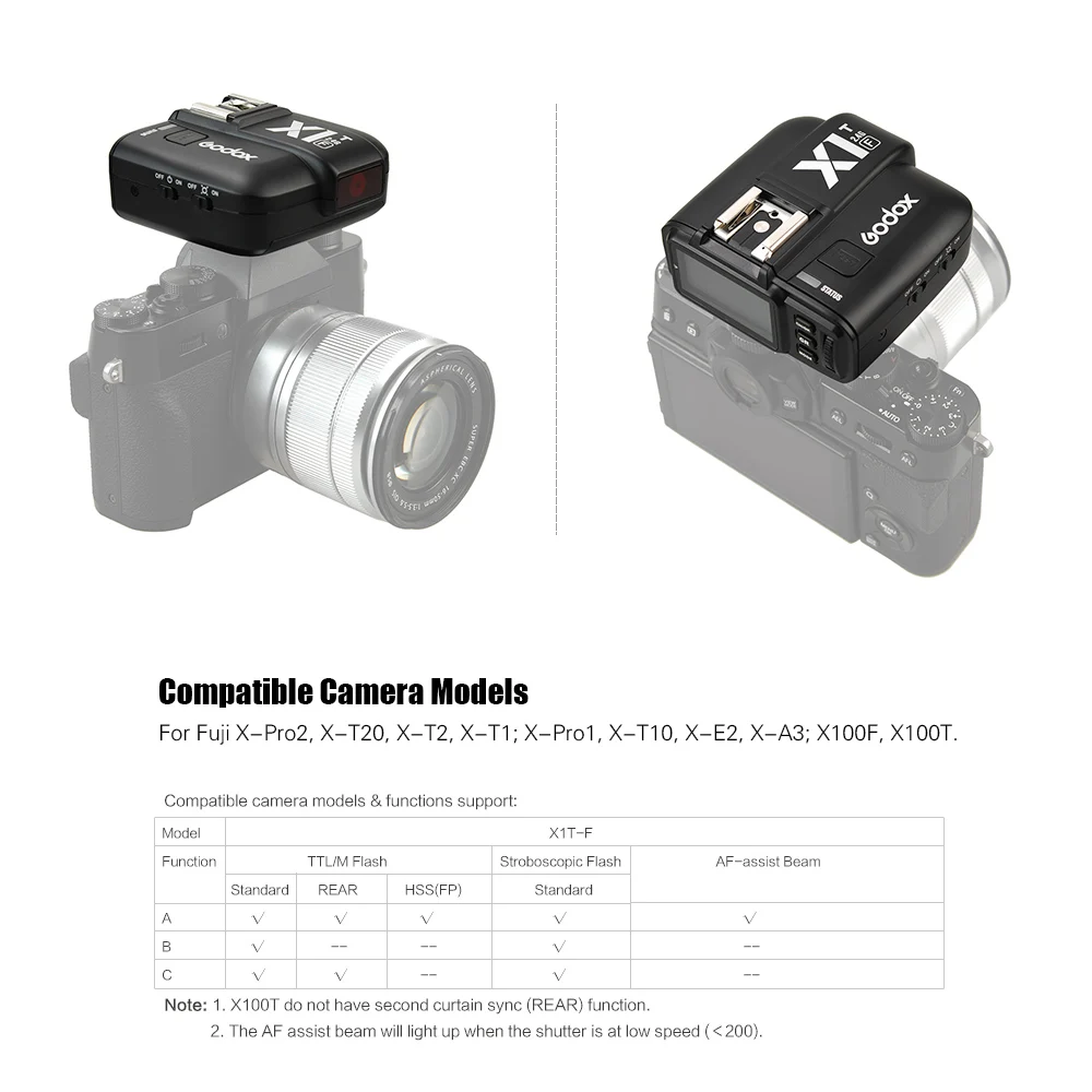 Совместимые камеры:Для Fuji X-Pro2, X-T20, X-T2, X-T1; X-Pro1, X-T10, X-E2, X-A3; X100F, X100T. Поддержка камер с разъемом для синхронизации ПК