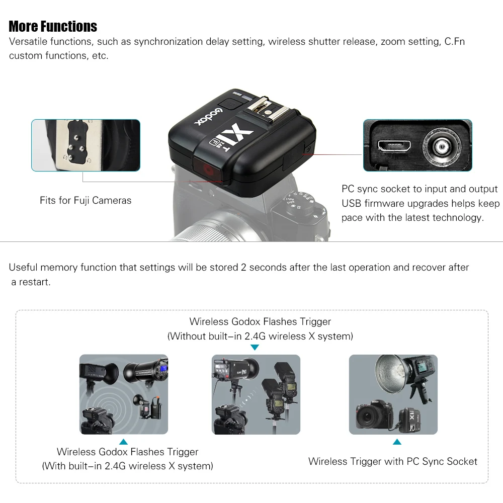 Со встроенной беспроводной передачей 2,4G X1T-F передатчик может дистанционно управлять вспышками Godox, которые имеют встроенную беспроводную систему 2,4G X. При использовании в комбинации с приемником XTR-16 или XTR-16S, X1T-F передатчик может дистанционно управлять вспышками Godox, которые не имеют встроенную беспроводную систему 2,4G X.