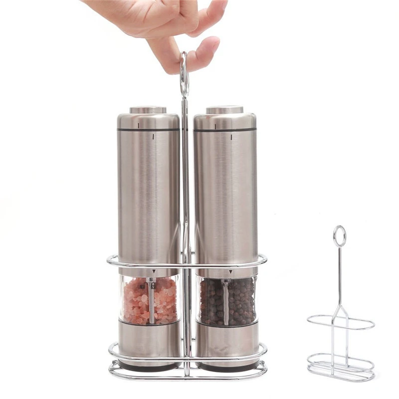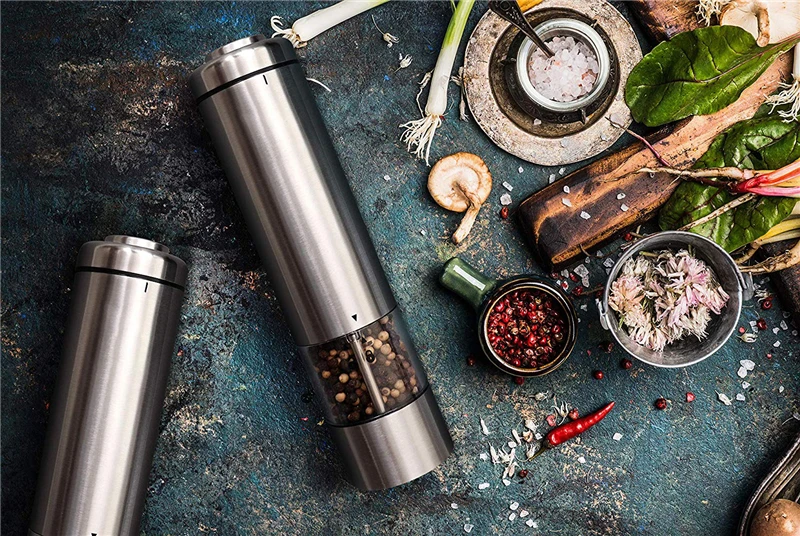 Два (2) на батарейках из нержавеющей стали мельницы для соли и перца с керамическими мельницами, акриловый контейнер для специй, светодиодный светильник и регулируемая грубость