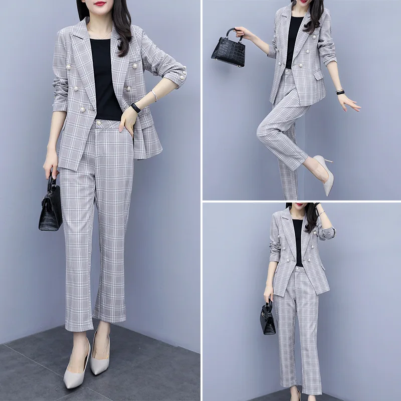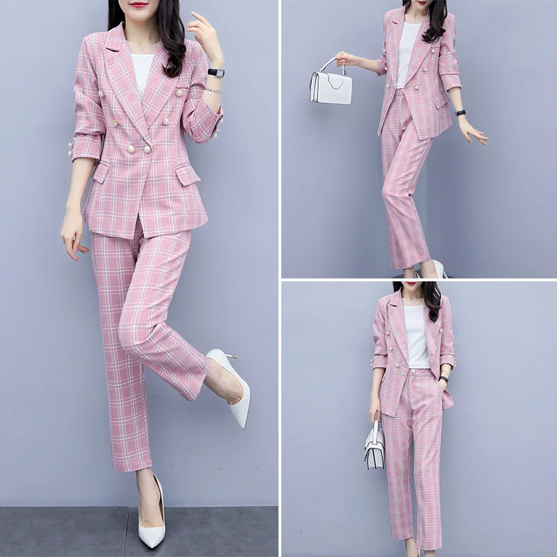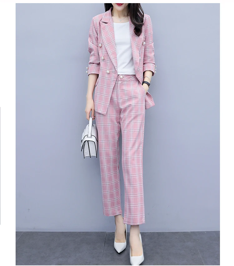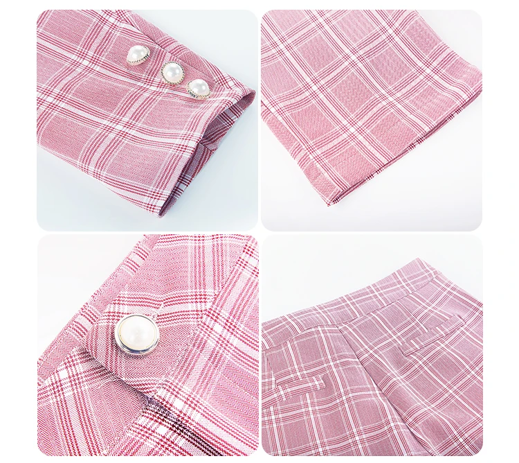 Осенний Новый женский костюм, повседневный двубортный розовый клетчатый костюм, женский костюм высокого качества, костюм из двух предметов