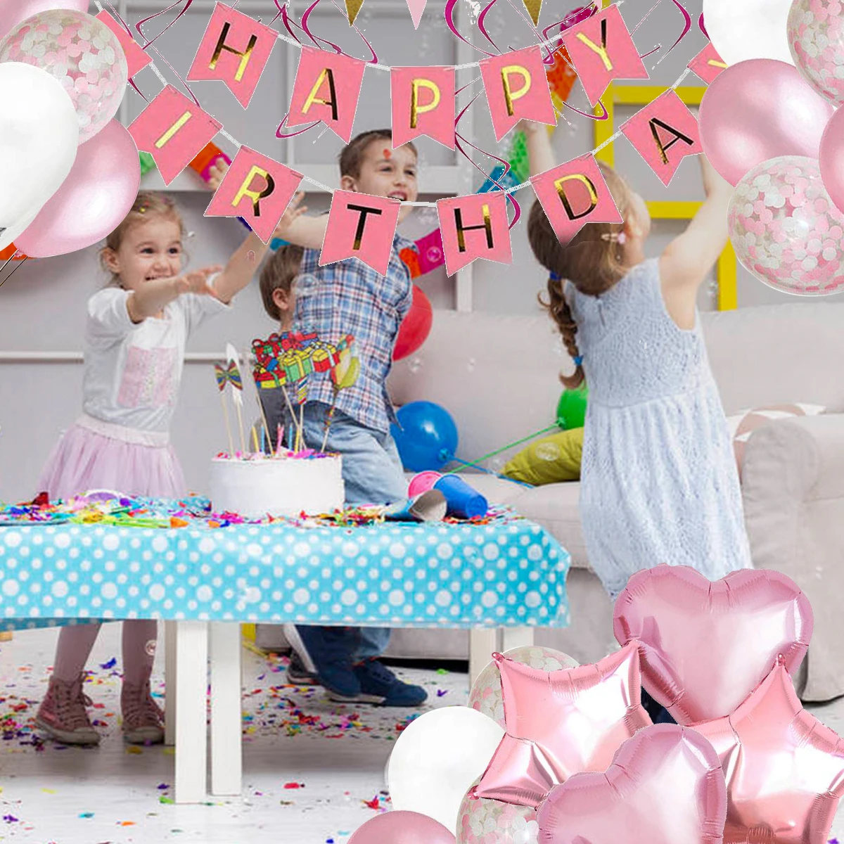 1. Этот комплект включает в себя 30 латексных шаров, 6 бумажных помпонов цветов, 5 шт свирлов, 1 шт счастливый плакат "с днем рождения", 1 шт треугольные флажки баннер, 2 шт шар из фольги в форме звезды и 2 шт шаров из фольги сердца.