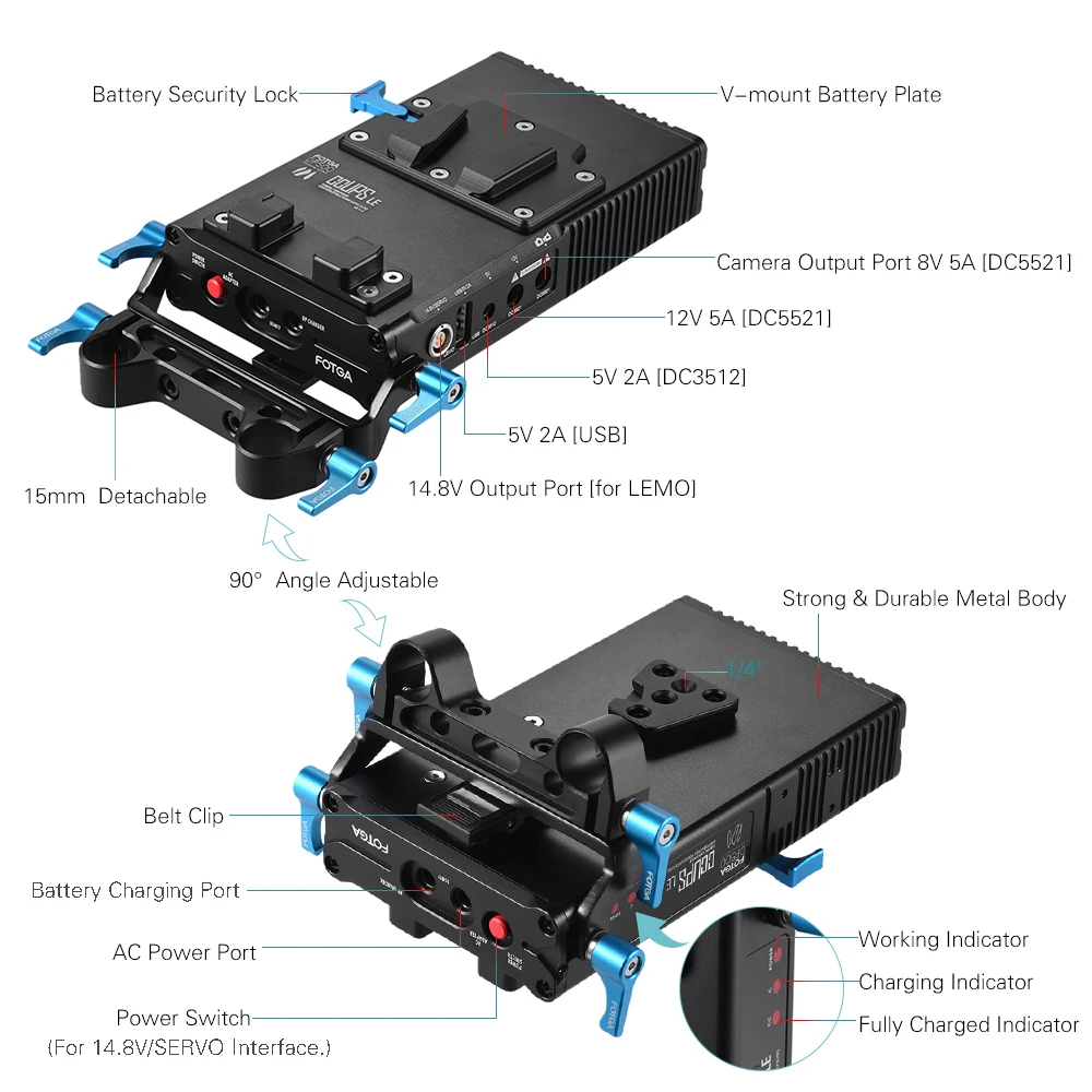FOTGA DP500III система питания имеет высокую эффективность. Это может быть пластина аккумулятора и зарядное устройство для V-mount батареи. Несколько выходных портов (5 В 2A / 8 в 5A / 12 В 5A/14,8 в/USB) подходят для большинства камер и видеокамер. Регулируемый угол 15 мм зажим стержня может быть установлен на рельсовом стержне или отсоединен. Для случаев, когда требуется несколько выходов интерфейса, эта Штабелируемая система питания, безусловно, будет хорошим выбором.