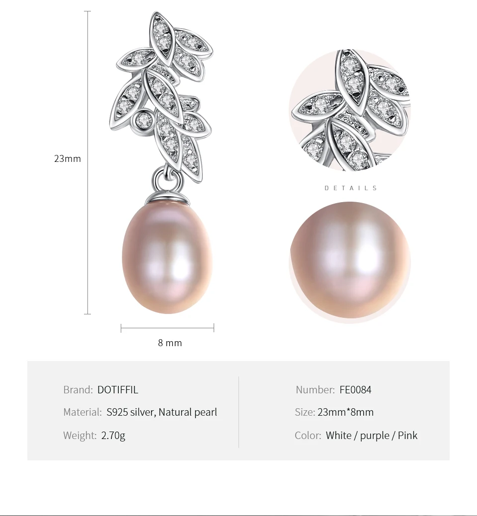 Бренд: DOTEFFIL Тип камня: 100% натуральный пресноводный жемчуг Цвет жемчуга: белый/розовый/фиолетовый Жемчужный Блеск: AAAAA Поверхность жемчуга: без дефектов Размер жемчуга: 23 мм Длина: около 8 мм Вес: 2,70 г Материал металла: 100% 925 пробы Серебряный Металлический штамп: S925 Упаковка: Подарочная сумка Они модные и элегантные, подходят для ношения круглый год Вы можете носить его на свадьбу/вечерние/помолвки/юбилей Роскошная блестящая ручная работа/высокое качество