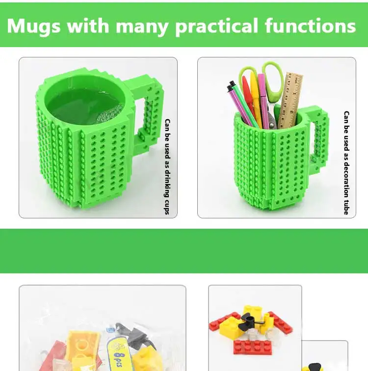 Это insteresting кружка с внешней поверхностью здания. Кофейная кружка и Строительный набор все в одном! Пить кофе во время строительства что-то действительно замечательное. Особенности: Материал: пищевой нетоксичный пластик Чашка поставляется с сумкой аксессуаров (3-4 блока ramdon). На корпусе и ручке чашки имеются стандартные интерфейсы. Вы просто выбираете блоки, которые вам нравятся, встаньте на них и создайте уникальную кружку. Эта чашка совместима с LEGO, PixelBlocks, Mega Bloks, KRE-O и K'NEX и т. д. Емкость: около 350 мл Примечание: Этот продукт может выдерживать 100 градусов по Цельсию, но не может быть помещен в микроволновую печь и посудомоечную машину. Пожалуйста, постирайте вручную!