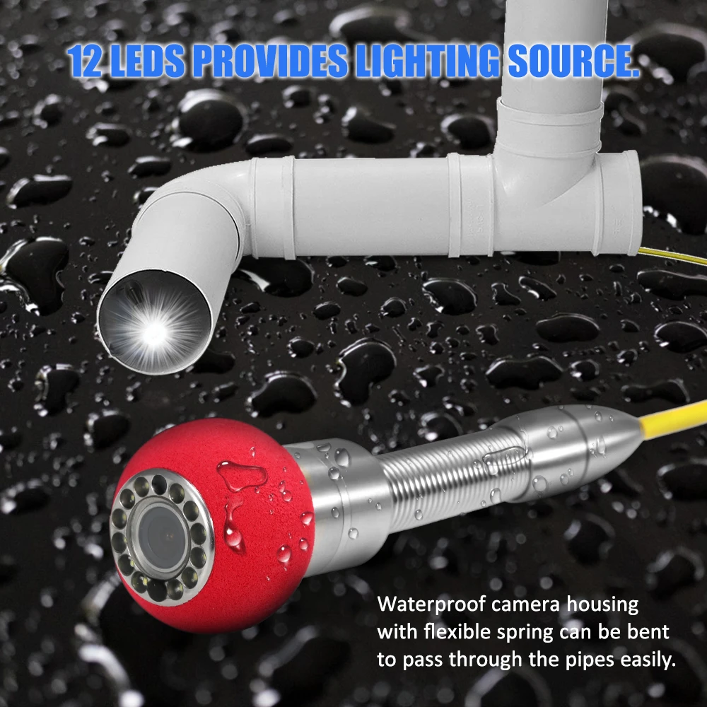 Легкий контроль: водонепроницаемый корпус камеры из нержавеющей стали с гибкой пружиной, чтобы легко пройти через гнущиеся трубы; Светодиодные фонари для освещения труднодоступных зон осмотра.
