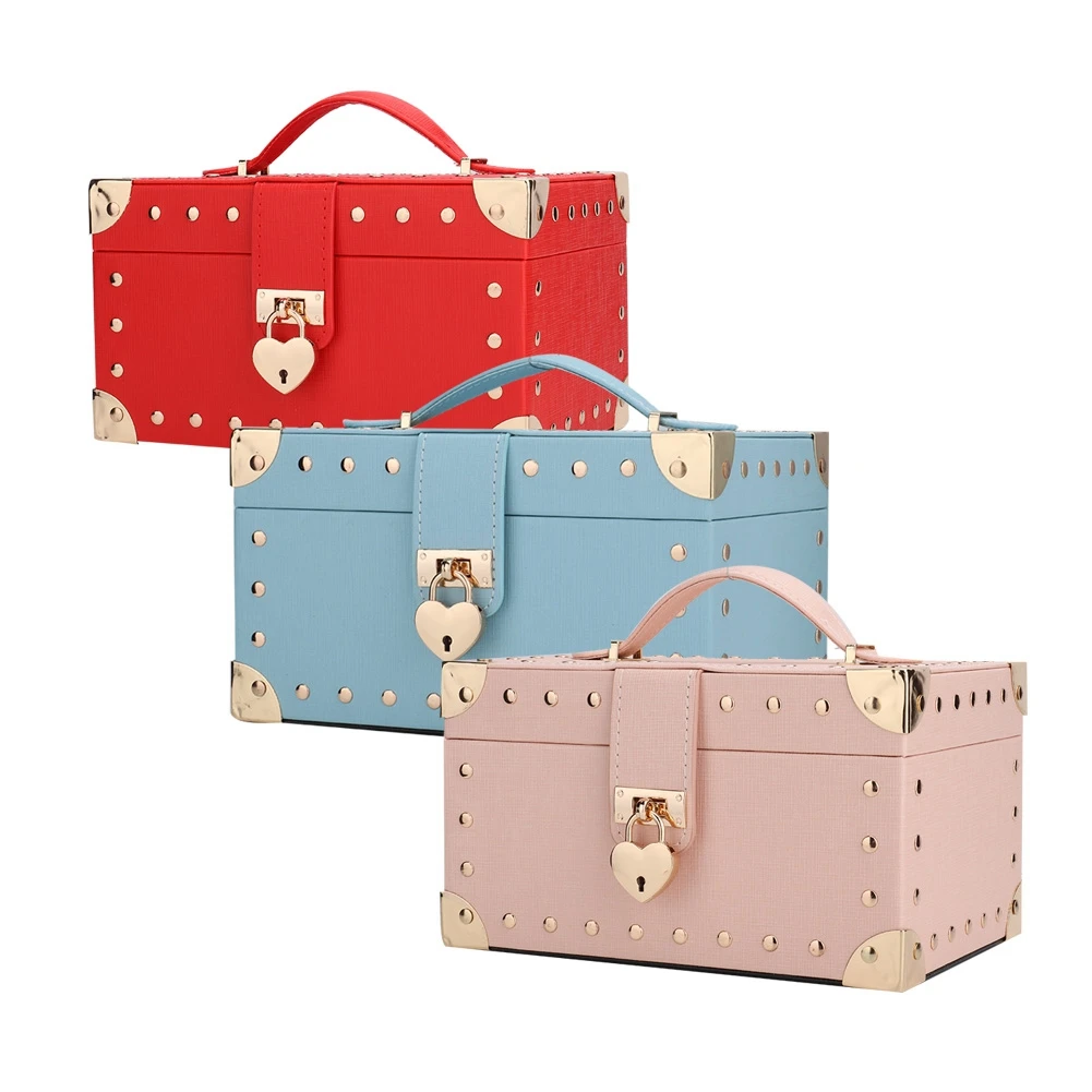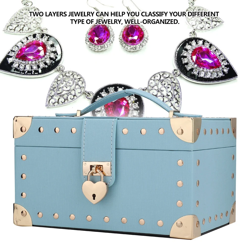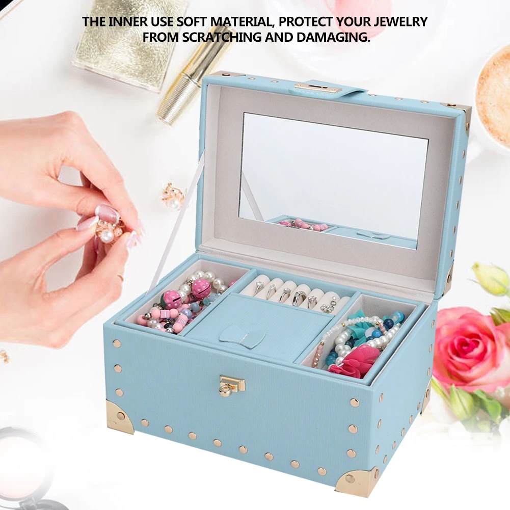 2-Layers Necklace Storage Earring Container Box Jewelry Holder with Handle Lock Mirror