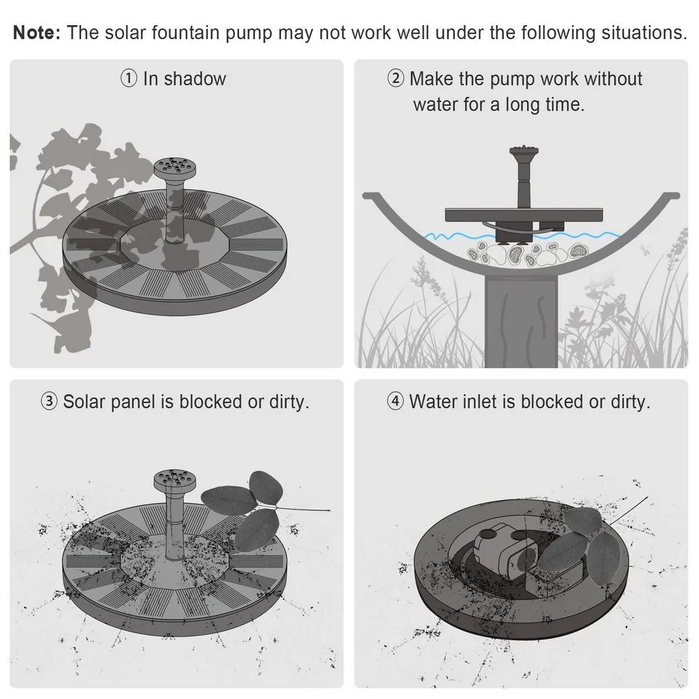1 Этот продукт является солнечным водным насосом прямого привода. Нет внешнего аккумулятора. Высота распыления воды полностью зависит от силы Солнца. При слабом солнце насос не будет работать непрерывно, но автоматически начнет работать до тех пор, пока Солнечный свет не достигнет определенной интенсивности. Насос обеспечивает непрерывную работу. При использовании поместите изделие в свободный солнечный свет. Блокировка теней повлияет на нормальную работу насоса. Если вам нужно хранить электричество или хранить светодиодный светильник, пожалуйста, используйте другие модели нашей компании. 2 насос должен быть полностью погружен в воду и не должен быть дегидратирован в течение длительного времени. Когда водяной насос просто погружен в воду, рекомендуется вставить насос в другую насадку после того, как вода распыляется нормально. 3 пожалуйста, держите источник воды в чистоте и регулярно чистите насос, чтобы предотвратить засасывание посторонних веществ водяным насосом, и насос не будет работать должным образом.