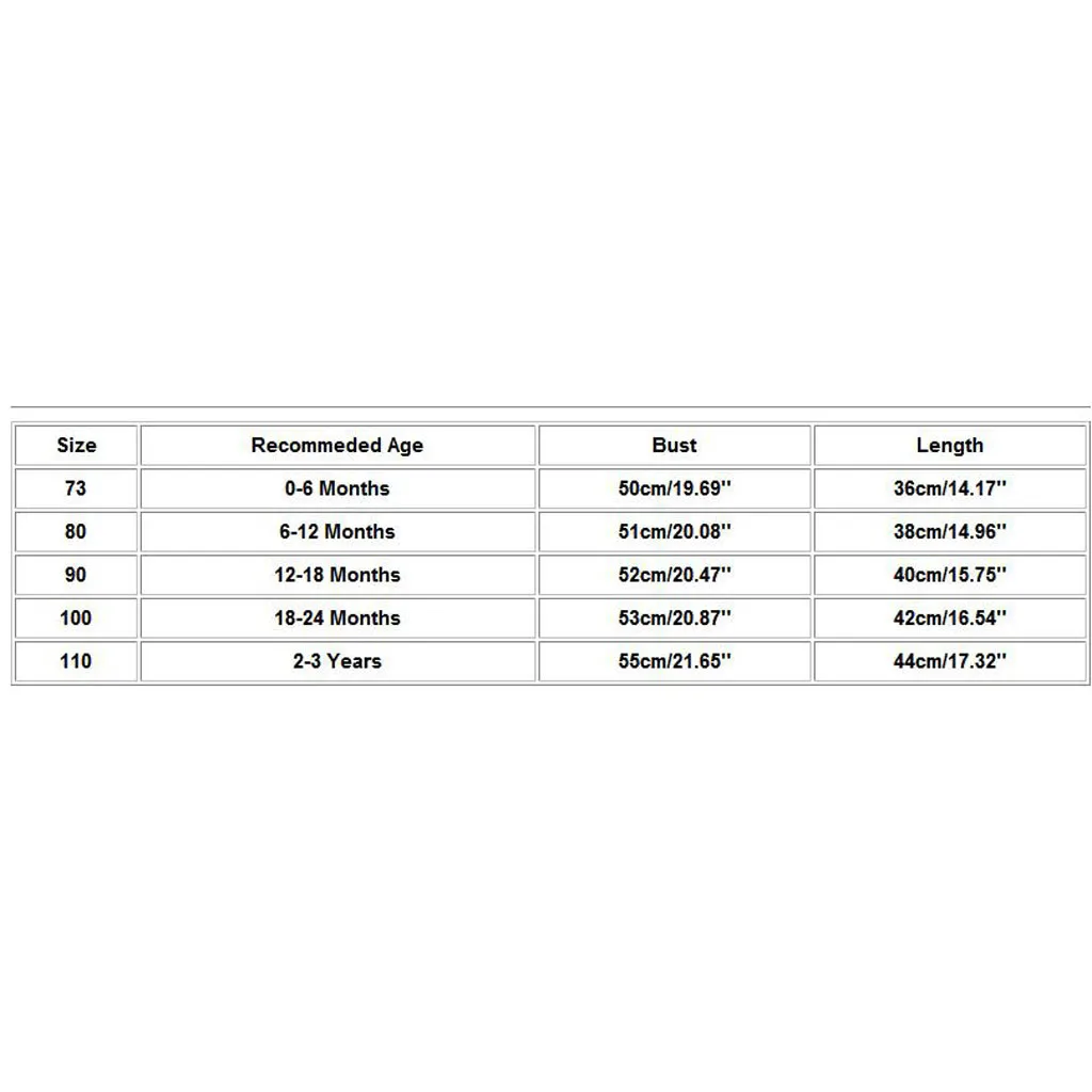 Размер Рекомендуемый возраст Обхват груди Длина 73 Для детей от 0 до 6 месяцев 50 см/19,69'' 36 см/14,17'' 80 6-12 месяцев 51 см/20,08'' 38 см/14,96'' 90 12-18 месяцев 52 см/20,47'' 40 см/15,75'' 100 18-24 месяцев 53 см/20,87'' 42 см/16,54'' 110 От 2 до 3 лет 55 см/21,65'' 44 см/17,32''