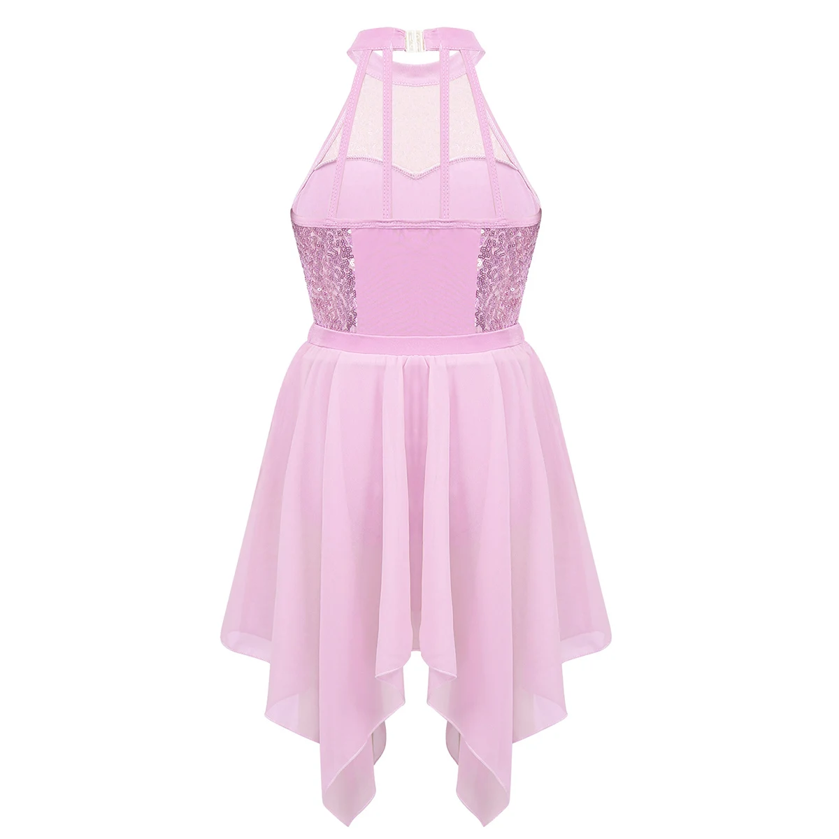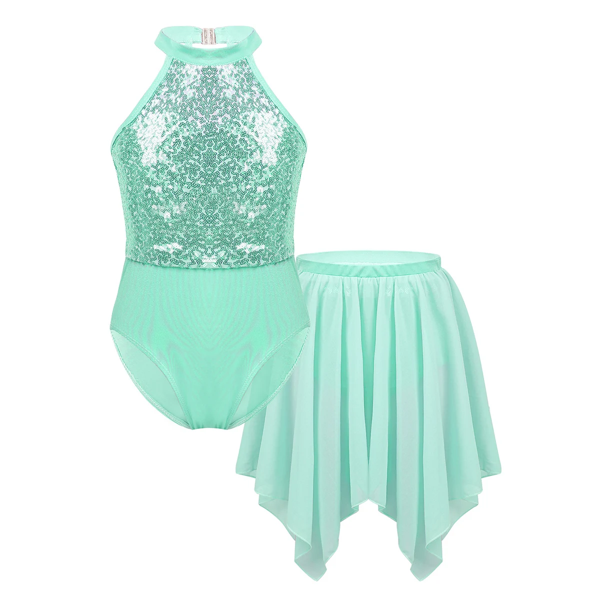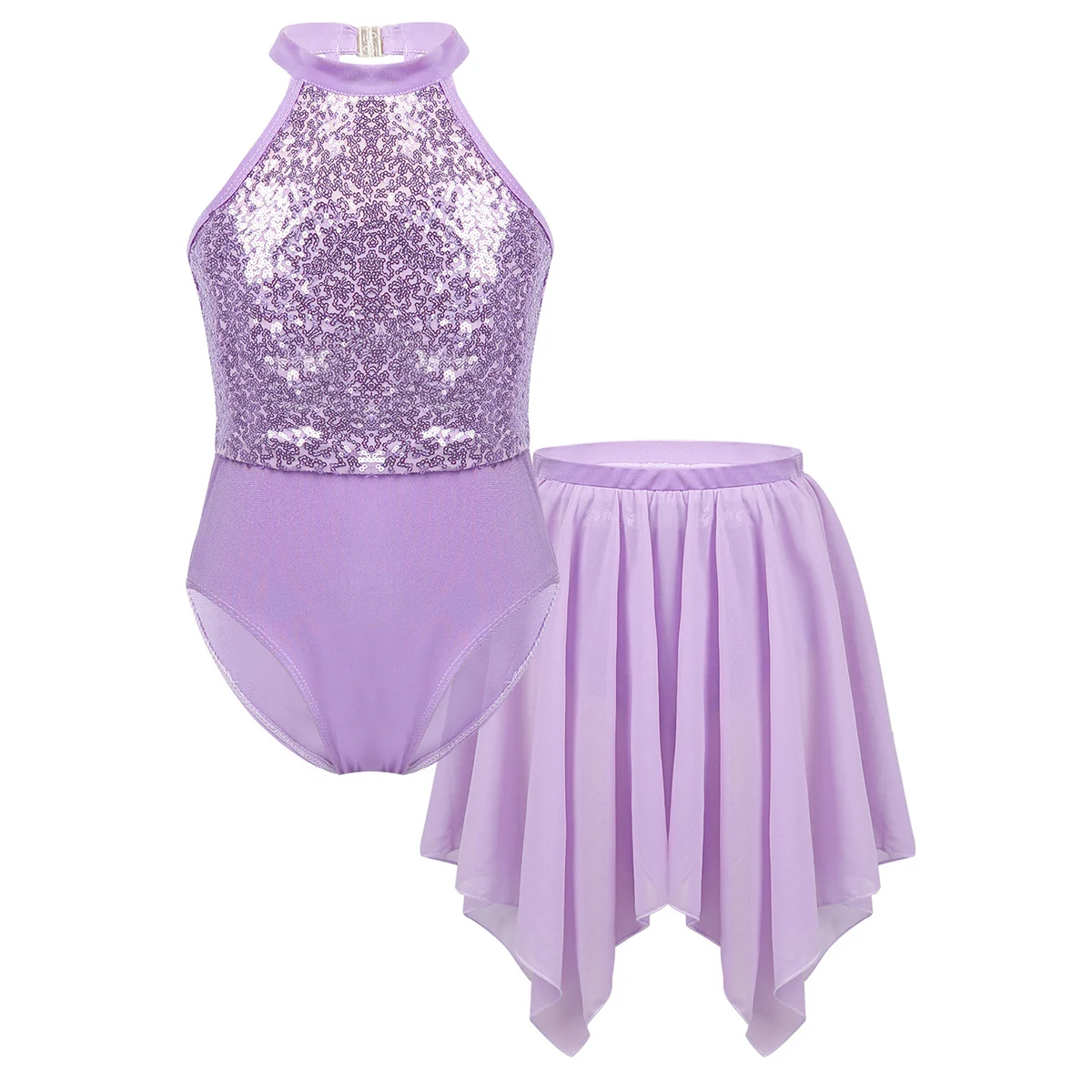 Балетная Экипировка изготовлена из полиэстера, спандекса и шифона, ручная стирка. Таблица размеров означает возраст для девочек, но только для общего руководства. Купальник без рукавов, вырез на шее с застежкой. Лиф с блестками и подкладкой. С ремешками и пряжками на спине. Раздельная шифоновая юбка с эластичным поясом и асимметричным подолом. Красивый и стильный комплект для вашей девочки. Подходит для занятий танцами, выступлений на сцене, балетных соревнований и т. д.