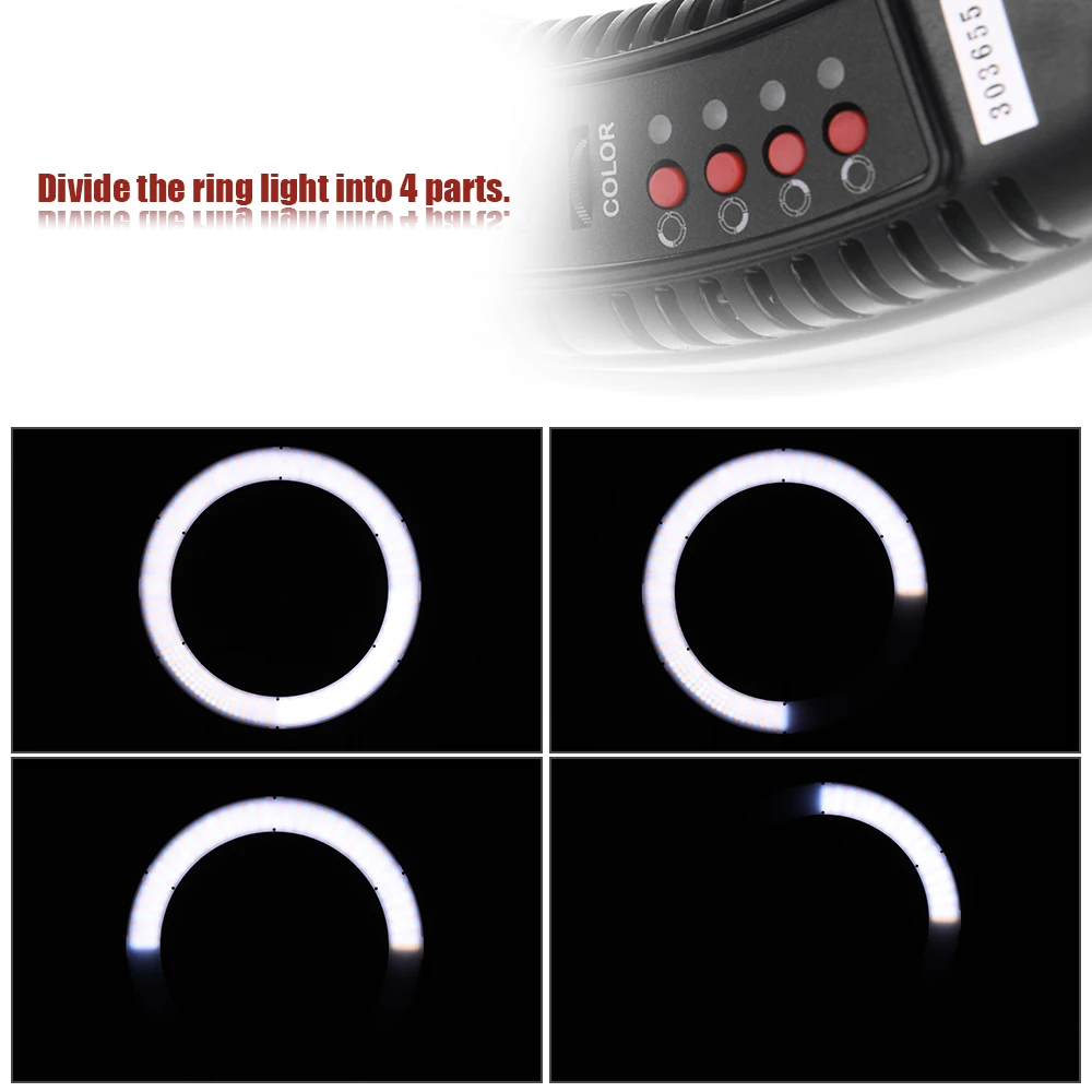 Плавная регулировка яркости, также может делить кольцевой свет на 4 части, чтобы создать различные световые эффекты.