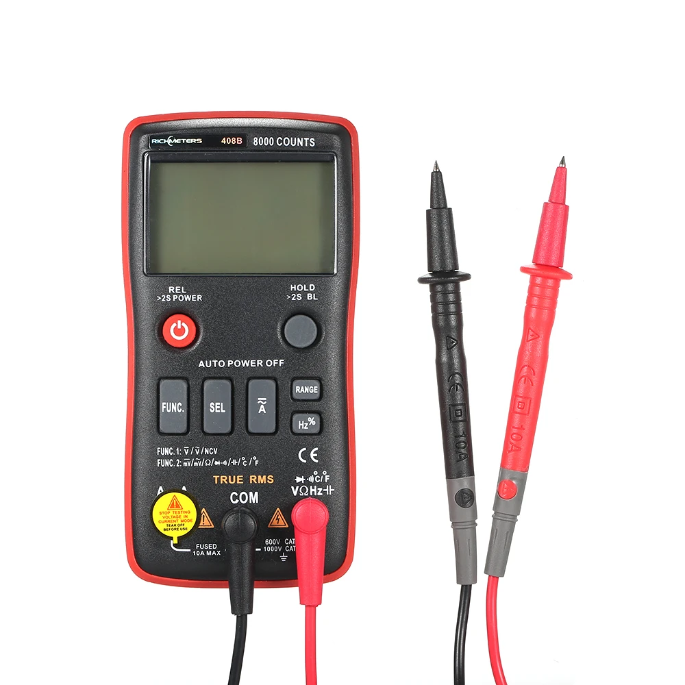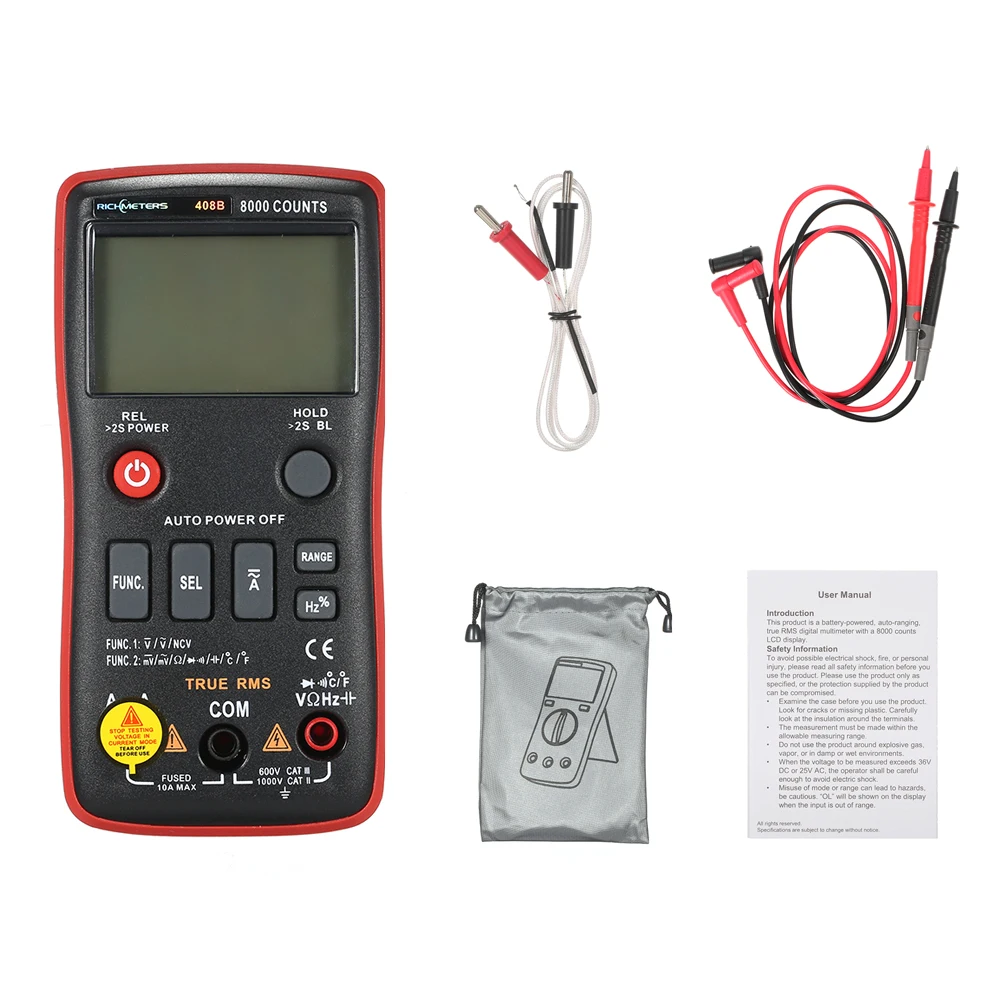 Этот RM408B портативный цифровой мультиметр прост в использовании с высокой надежностью и портативностью, идеальный инструмент для лаборатории, фабрики и дома. Он может измерять напряжение переменного/постоянного тока, ток переменного/постоянного тока, сопротивление, емкость, частоту, рабочий цикл, диод, непрерывность и температуру.