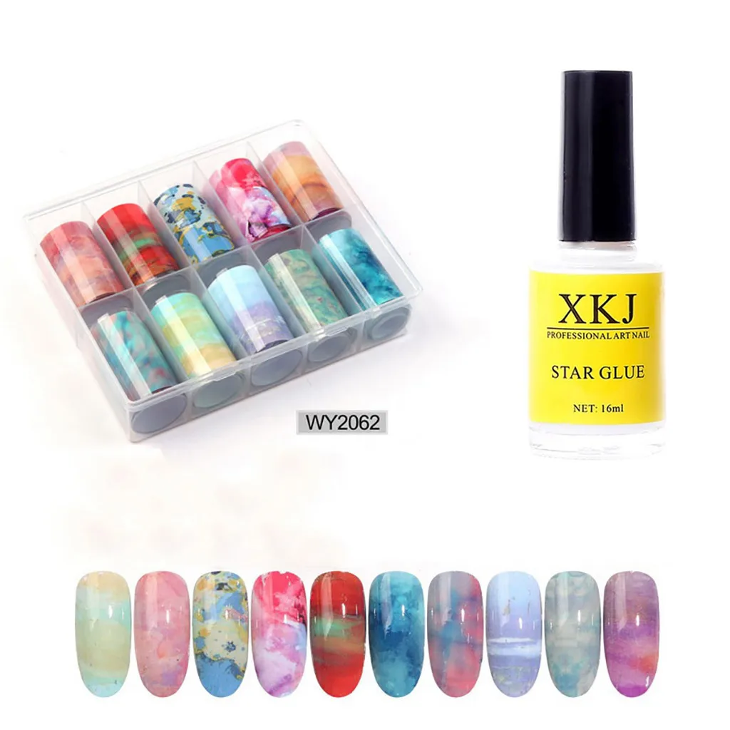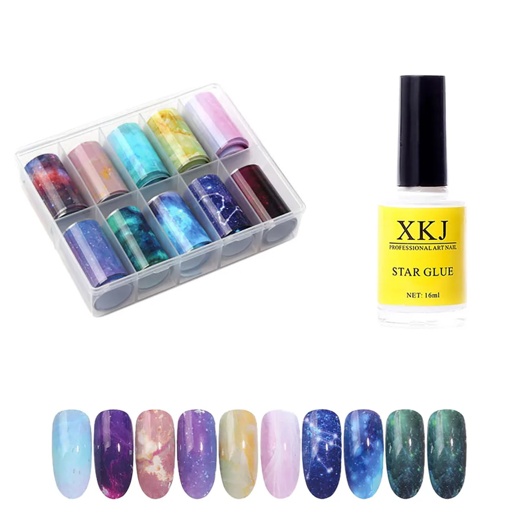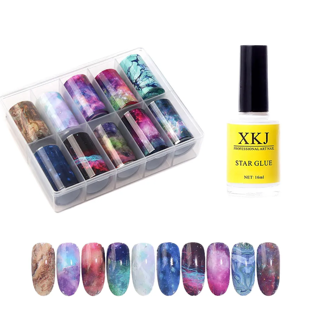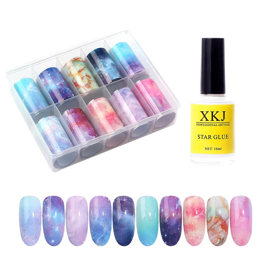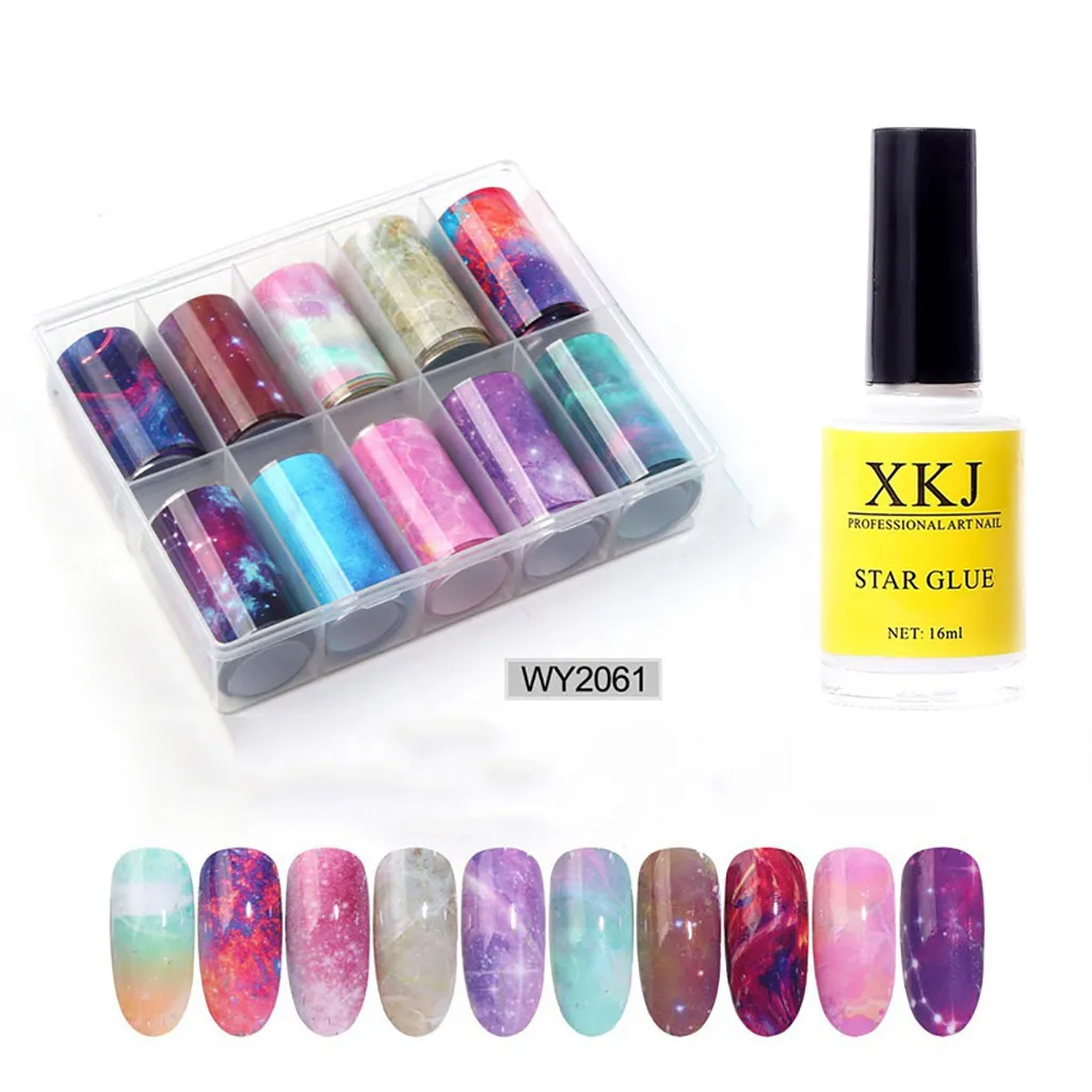 Фольга для перевода на ногти 10 цветов наклейки для украшения кончиков ногтя и звезда Клей Набор