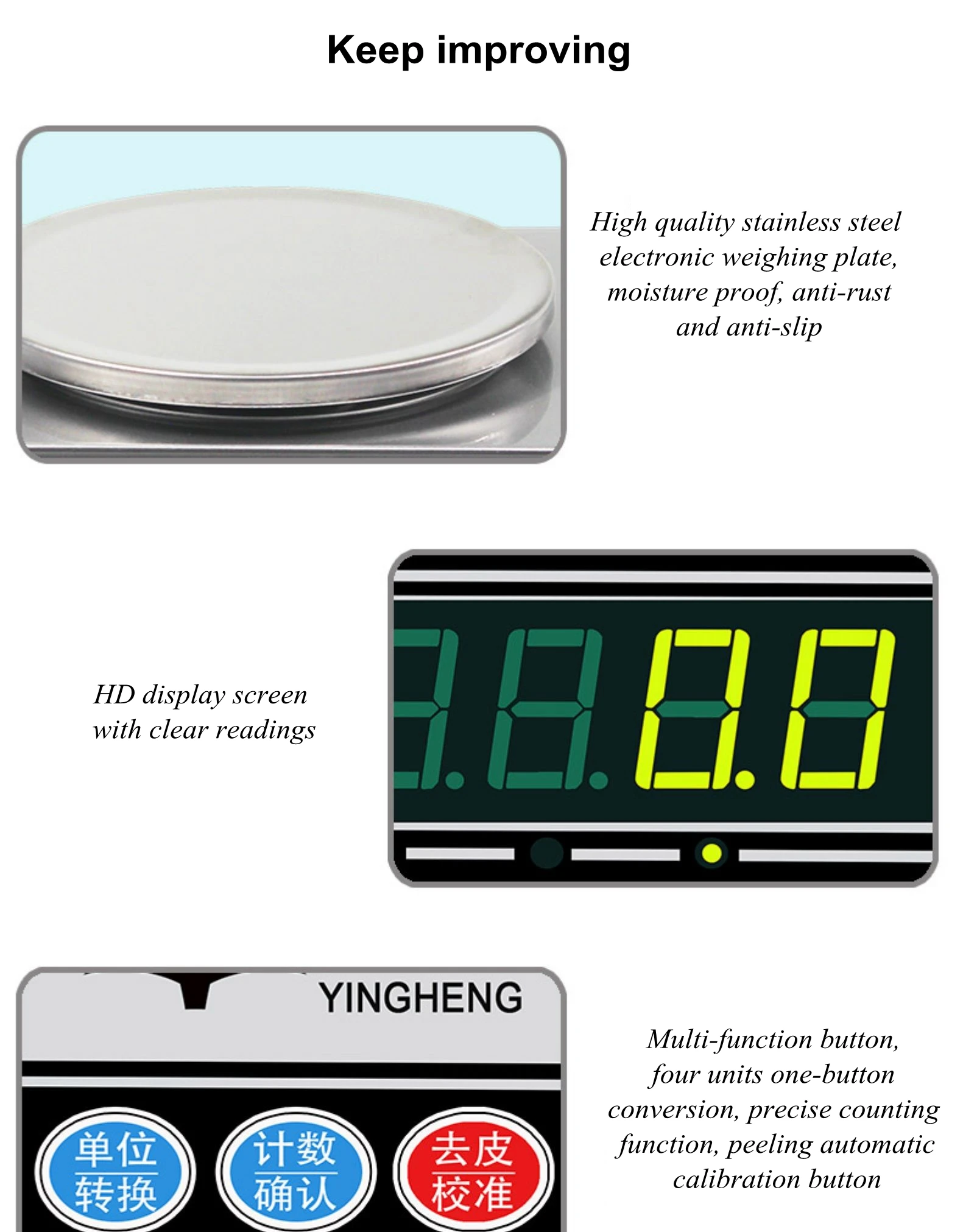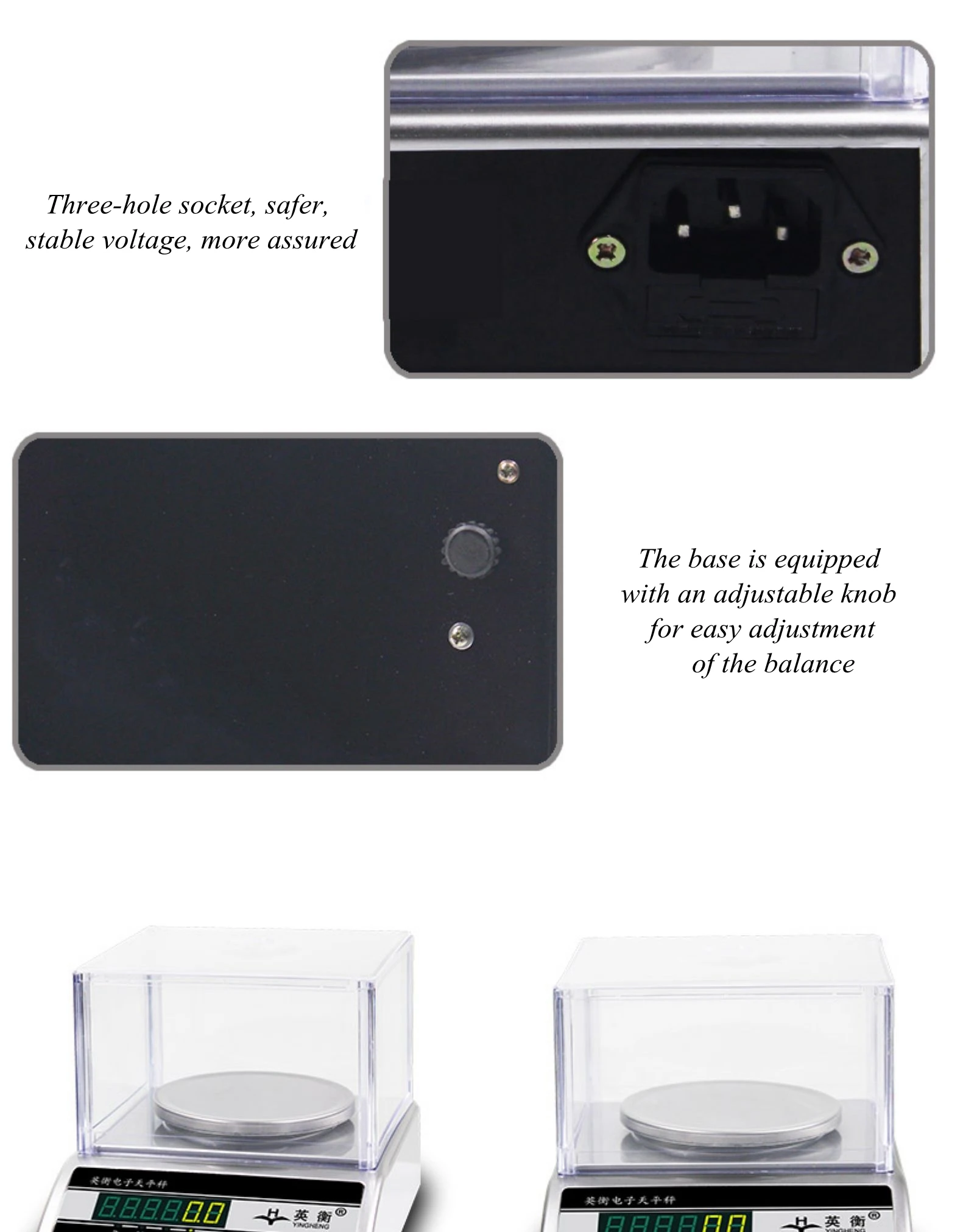 1. Высококачественная электронная весовая пластина из нержавеющей стали, влагостойкая, антикоррозийная и нескользящая. 2. Hd-экран, четкие показания. 3. Многофункциональная кнопка, четыре единицы преобразования одного ключа, Точная функция подсчета, Кнопка автоматической калибровки пилинга. 4. Гнездо с тремя отверстиями, более безопасное, стабильное напряжение, более гарантированное. 5. Основание оснащено регулируемой ручкой для легкой регулировки баланса тела.