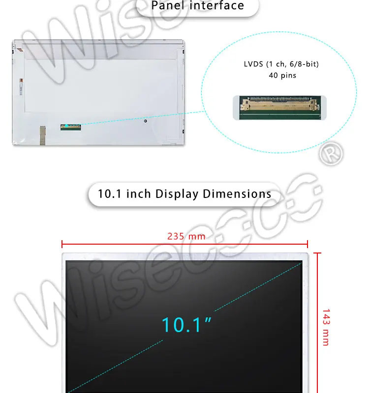 Диагональ экрана: 10,1 дюймов Тип экрана: LCM , a-Si TFT-LCD Номер пикселя: 1024(RGB)* 600 (WSVGA) Активная площадь (мм): 222,72*125,28 (В * В) Угол обзора: 80/80/75/80 (Typ.)(CR≥ 10) Яркость: 450 Подсветка: светодиодный, 30K часов, светодиодный драйвер Используется для: Промышленный ноутбук Raspberry Pi 3 Тип сигнала: LVDS (1 ch, 6/8-bit) , разъем, 40 контактов