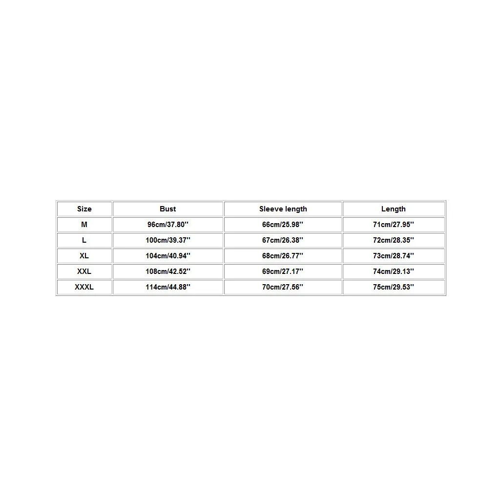 Пожалуйста, сравните детальные размеры с вашими перед покупкой! Цвета могут немного отличаться в зависимости от настроек компьютера и монитора Пожалуйста, учитывайте разницу в 1-3 см из-за ручного измерения, спасибо (все измерения в см и обратите внимание, что 1 см = 0,39 дюйма) Размер Бюст Длина рукава Длина М 96 см/37,80'' 66 см/25,98'' 71 см/27,95'' L 100 см/39,37'' 67 см/26,38'' 72 см/28,35'' XL 104 см/40,94'' 68 см/26,77'' 73 см/28,74'' XXL 108 см/42,52'' 69 см/27,17'' 74 см/29,13'' XХХL 114 см/44,88'' 70 см/27,56'' 75 см/29,53''