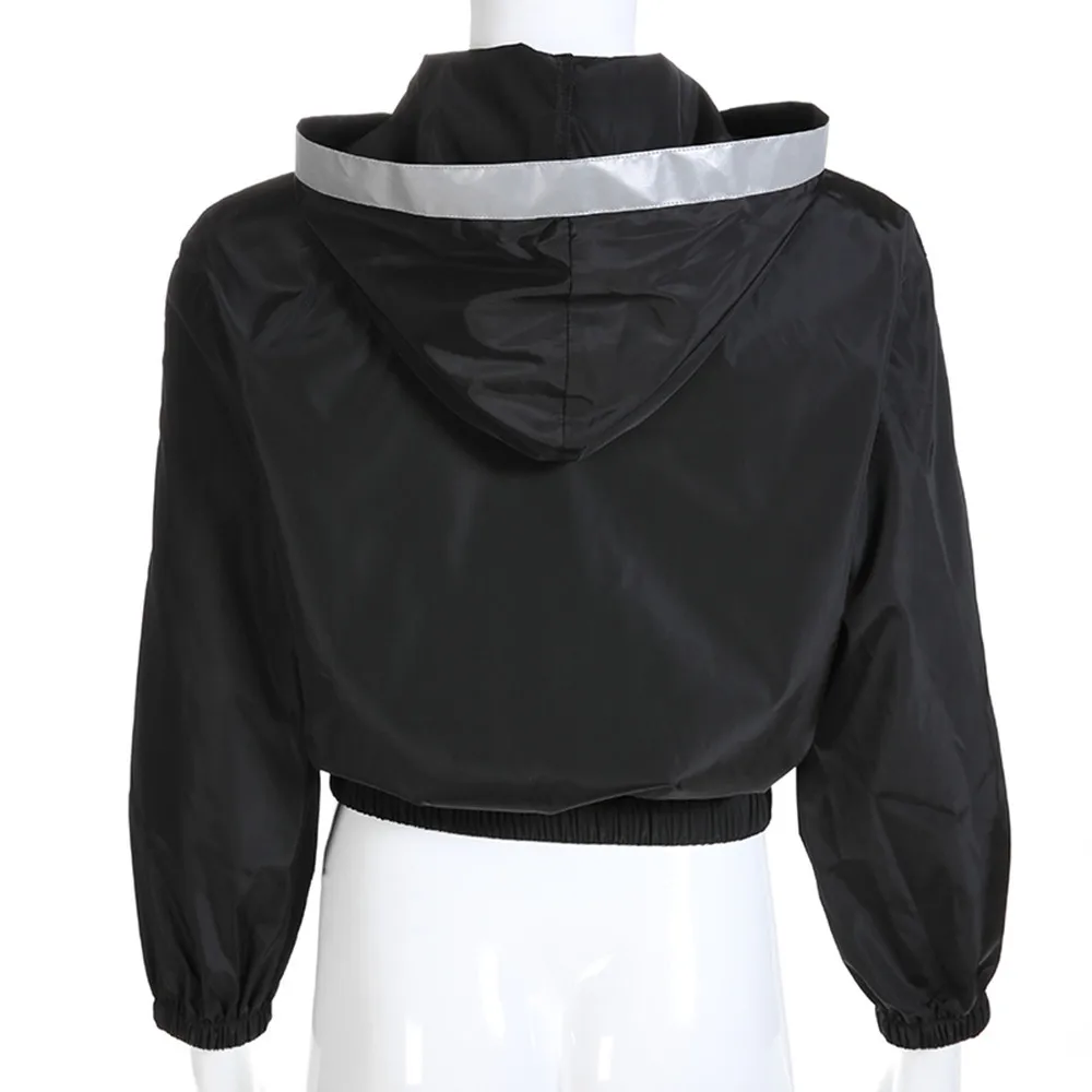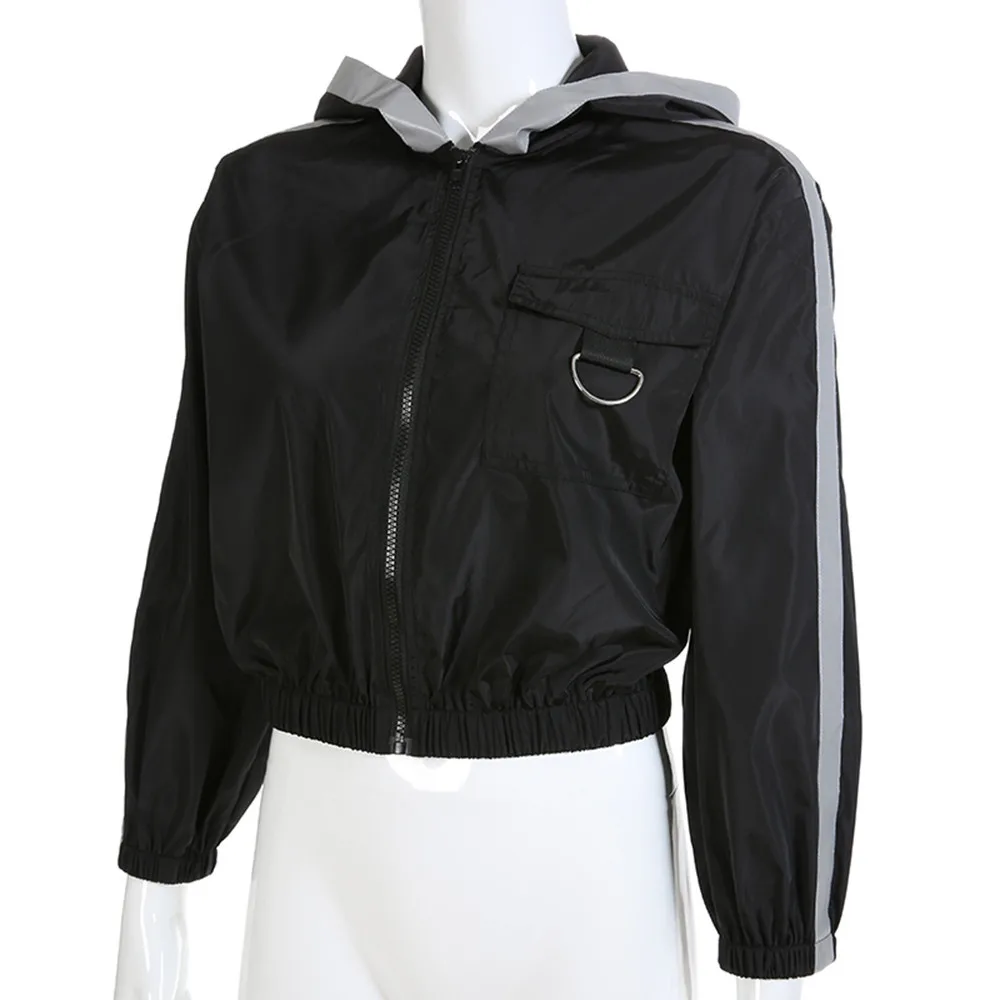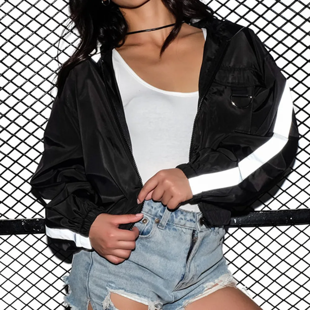 Women Flash Strip Short Metal Pocket Zipper Sexy Hooded Jacket