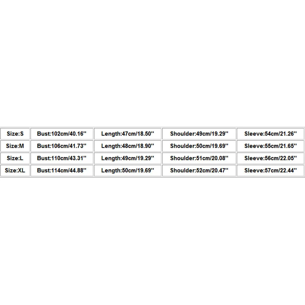 Size Bust Length Shoulder Sleeve S 102cm/40.16'' 47cm/18.50'' 49cm/19.29'' 54cm/21.26'' M 106cm/41.73'' 48cm/18.90'' 50cm/19.69'' 55cm/21.65'' L 110cm/43.31'' 49cm/19.29'' 51cm/20.08'' 56cm/22.05'' XL 114cm/44.88'' 50cm/19.69'' 52cm/20.47'' 57cm/22.44''