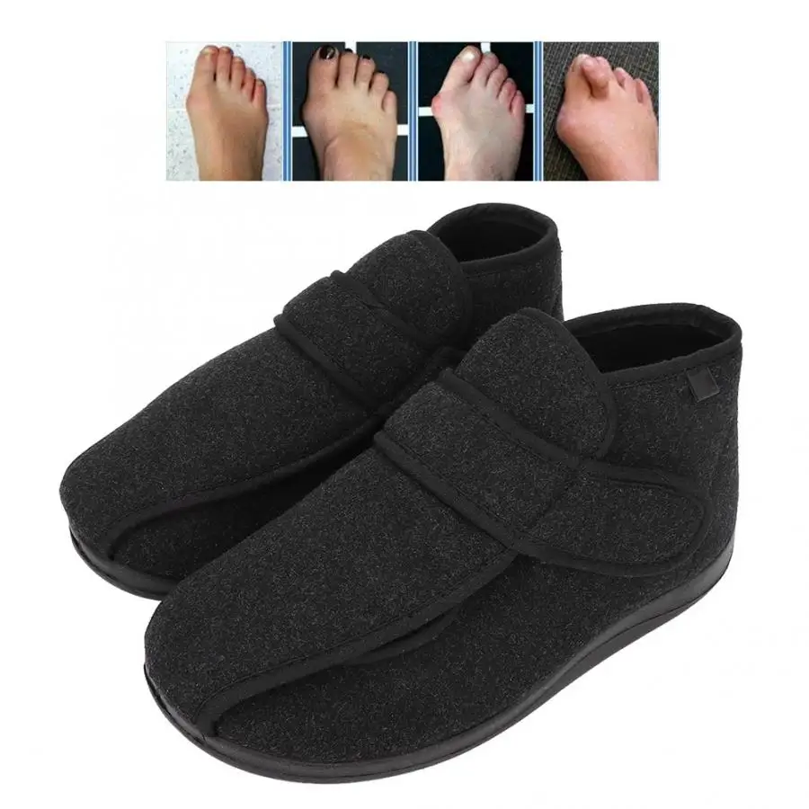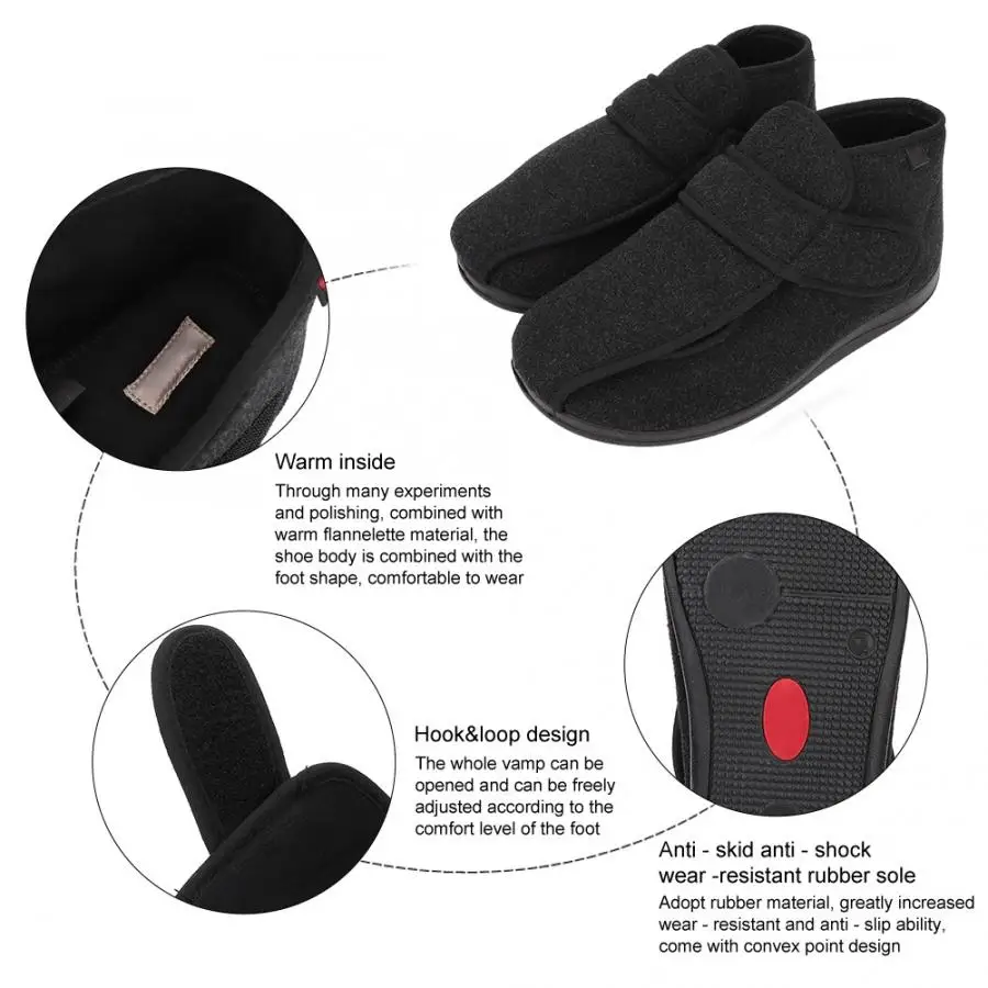Дизайн крючка и петли, весь вамп может быть открыт и может быть свободно отрегулирован в соответствии с уровнем комфорта стопы. Удобный регулируемый круглый носок, достаточная ширина и глубина дизайна могут регулировать комфорт в любое время, подходит для нескольких типов ног. Противоскользящая, амортизирующая и износостойкая резиновая подошва изготовлена из резинового материала, что значительно повышает износостойкость и противоскользящую способность и оснащена выпуклой точкой. Двухслойная конструкция регулировки, подходит для специальных ног, таких как толстые ноги, широкие ноги, опухшие ноги, ноги eversion и деформационные ноги. Пена с эффектом памяти, эргономичная конструкция подошвы, облегчающая нагрузку на ноги. Усиленная пятка сзади, чтобы обувь не падала при ходьбе и делает форму обуви более устойчивой без деформации.