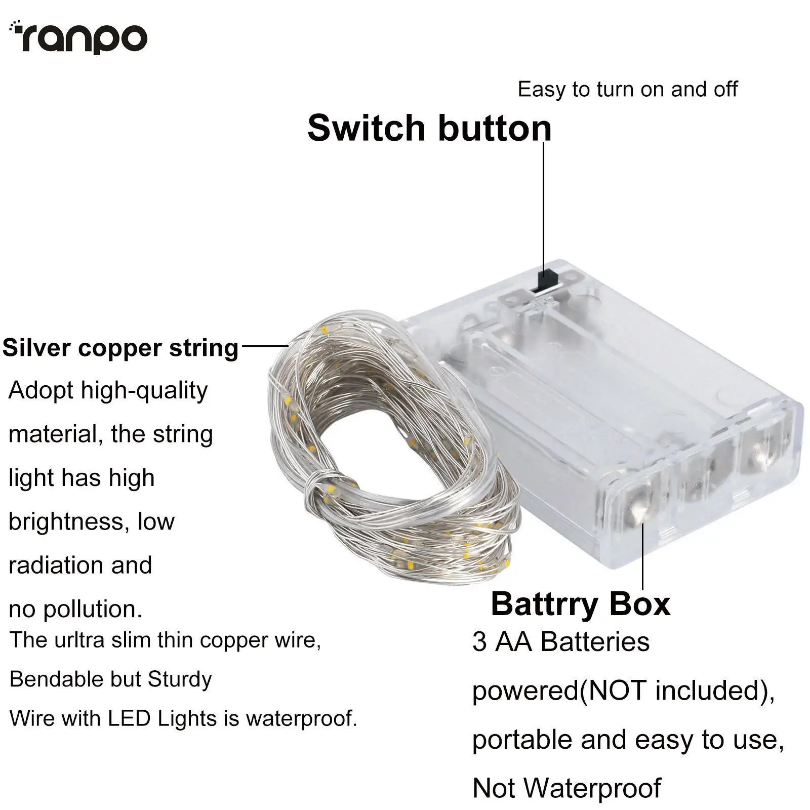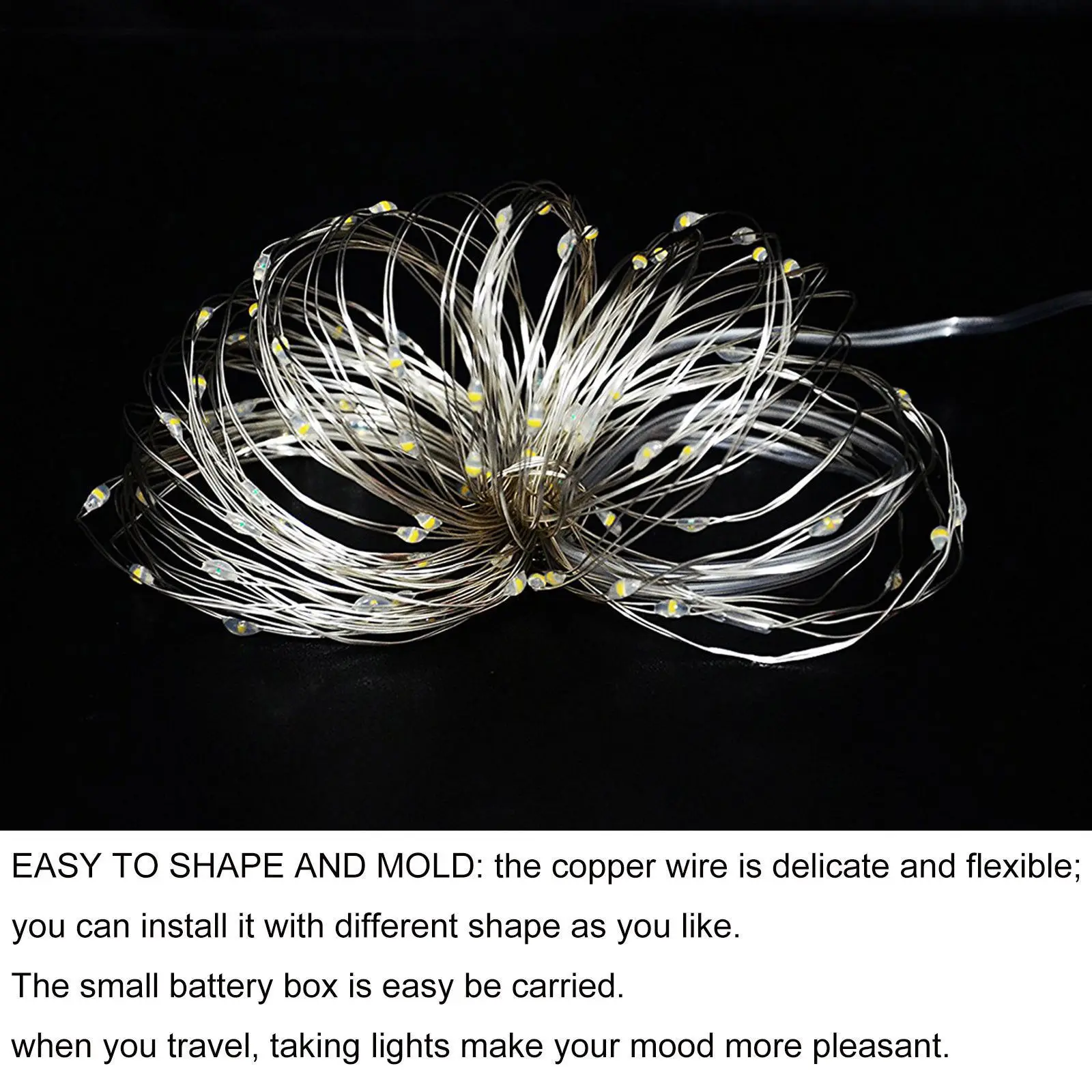 Модель: светодиодный Сказочный светильник (батарея в комплект не входит) Цвет: холодный белый/теплый белый Размер: 1 м/2 м/3 м/4 м/5 м Кол-во светодиодов: 10 светодиодов/20 светодиодов/30 светодиодов/40 светодиодов/50 светодиодов Водонепроницаемость: водонепроницаемый Водонепроницаемый Класс: IP65 Кабель Материал: Медь Тип батареи: 3 * AA батареи (батарея не входит в комплект) Гарантия: 3 года Режимы работы: стабильный