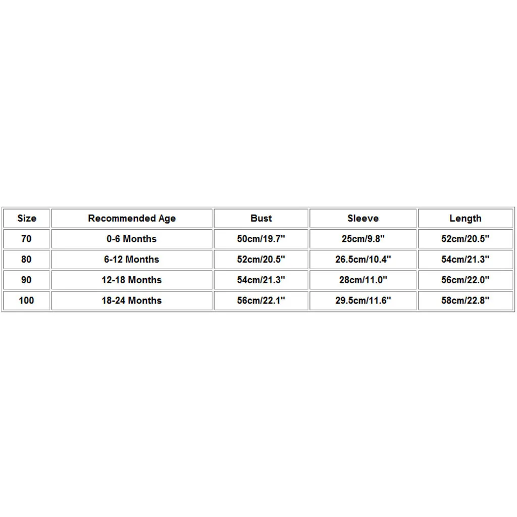 Размер Рекомендуемый возраст Бюст Рукав Длина 70 0-6 месяцев 50 см/19,7" 25 см/9,8 дюйма 52 см/20,5 дюйма 80 6-12 месяцев 52 см/20,5 дюйма 26,5 см/10,4 дюйма 54 см/21,3" 90 12-18 месяцев 54 см/21,3" 28 см/11,0" 56 см/22,0" 100 18-24 месяцев 56 см/22,1" 29,5 см/11,6 дюйма 58 см/22,8"