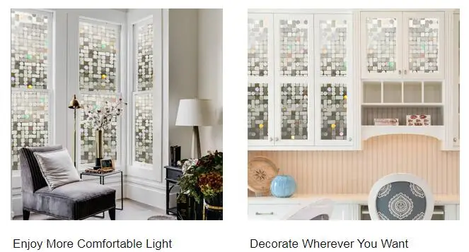 Без клея: без клея конфиденциальная стеклянная пленка сокращает химический выброс, статическое прилипание к поверхности, очищает и прилипает, применяется в течение нескольких минут Легкое удаление: съемная защитная дверная пленка не оставляет следов при удалении, может быть повторно использована несколько раз Защита от ультрафиолета и энергосбережение: наклейка на окно с термоконтролем сохраняет тепло зимой и сохраняет его летом, сокращает расходы на энергию, блокирует 96% УФ-лучей Многоцелевой: декоративные окна цепляются имеет широкие приложения для дома и офиса окна, кухонный шкаф, раздвижные двери, sidelights и т. Д. Защита конфиденциальности: декоративная оконная пленка размывает нежелательные виды, одновременно осветляя комнату мягким естественным светильник. Уровень конфиденциальности:★★★☆☆