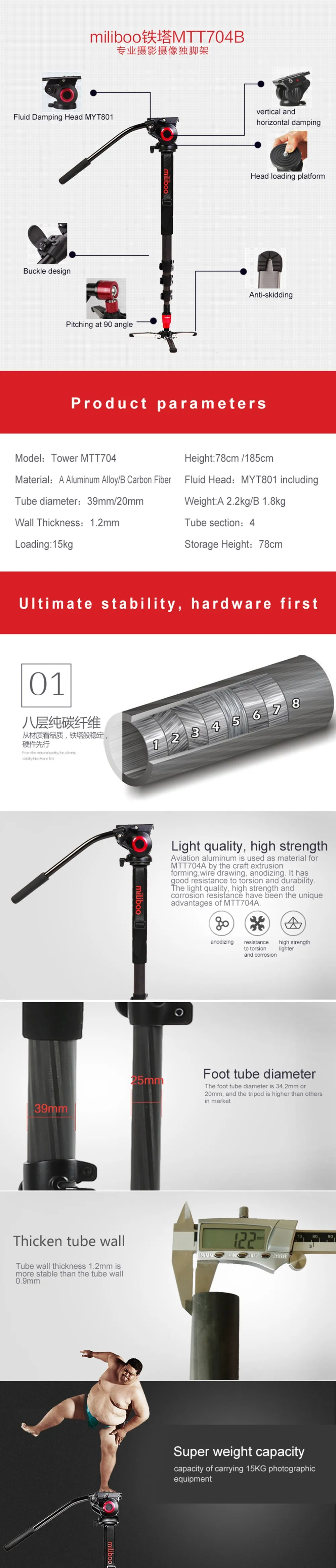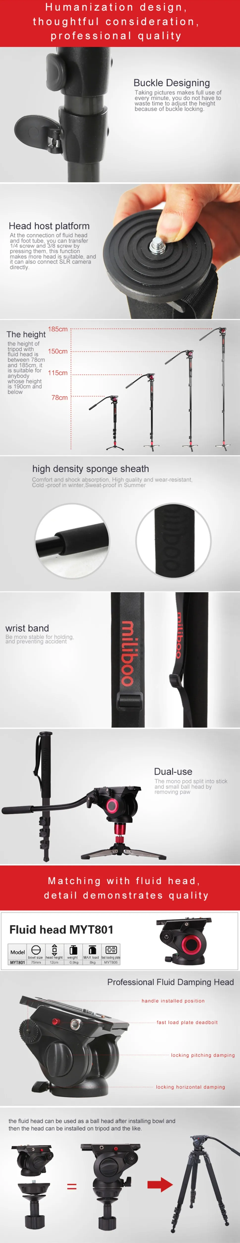 Miliboo MTT704B является профессиональной камерой и моноподом видеокамеры, она обеспечивает большую гибкость и стабильность в использовании. Монопод разделен на палку и маленькую шаровую головку, удаляя лапу, если вам нужно.