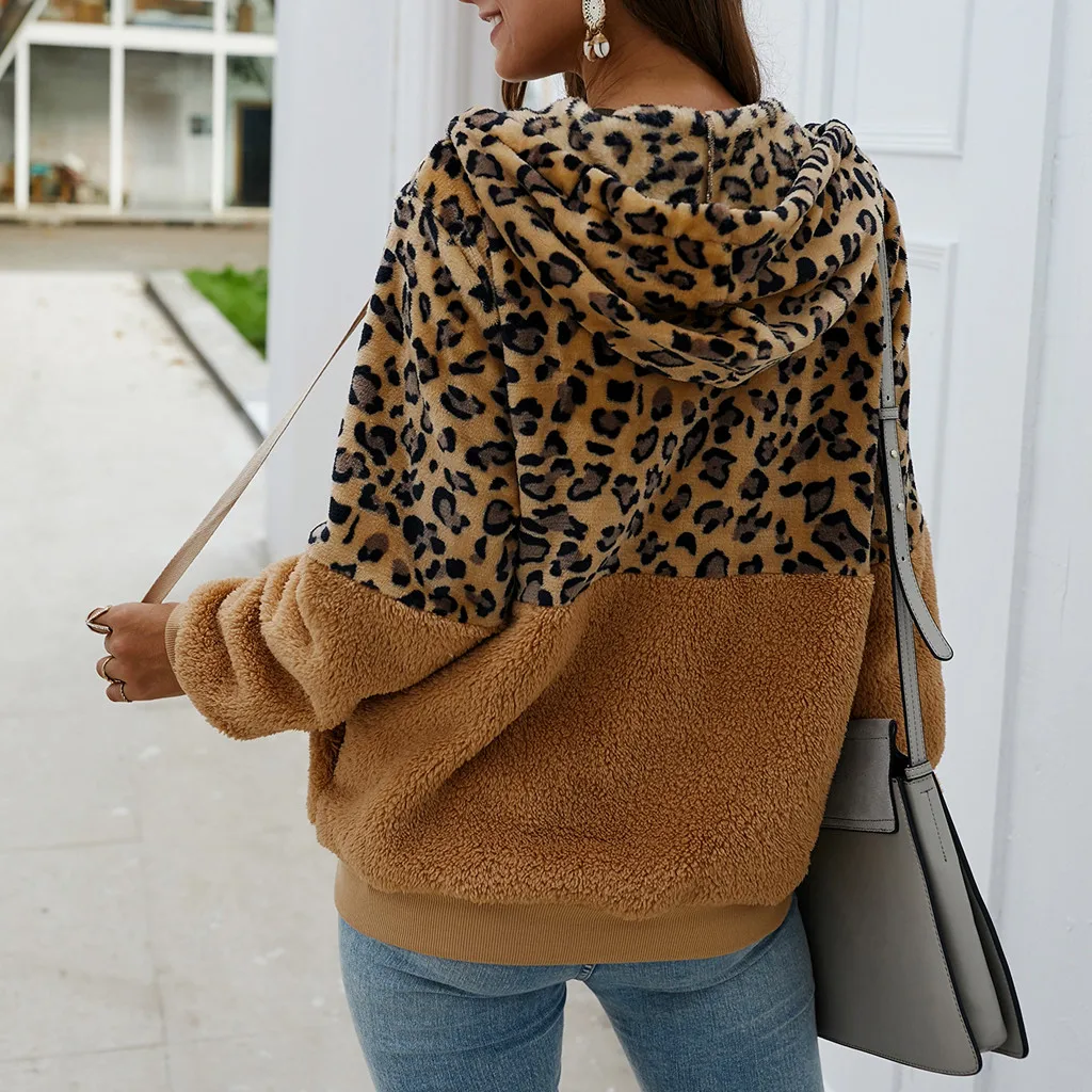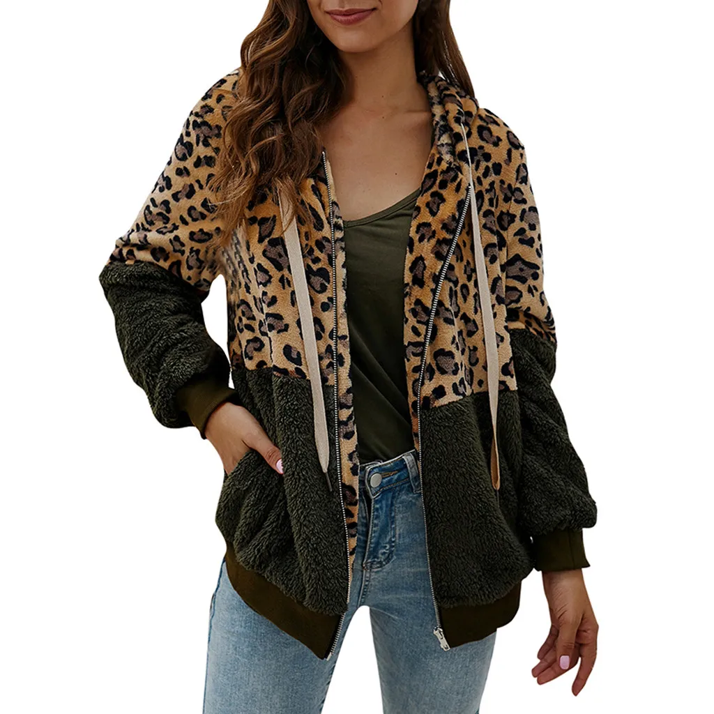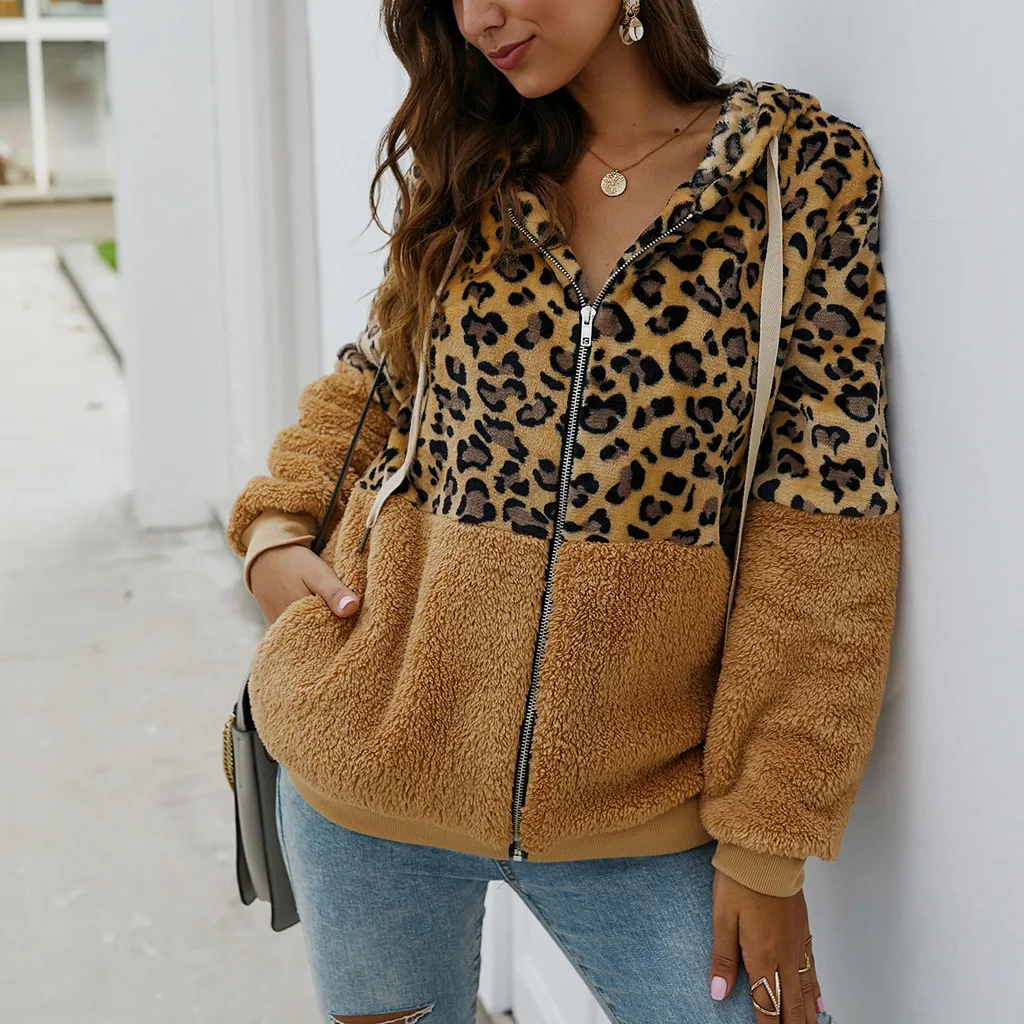 Women Leopard Print Patchwork Fleece Long Sleeves Cardigan Zipper Keep Warm Coat