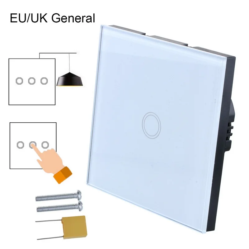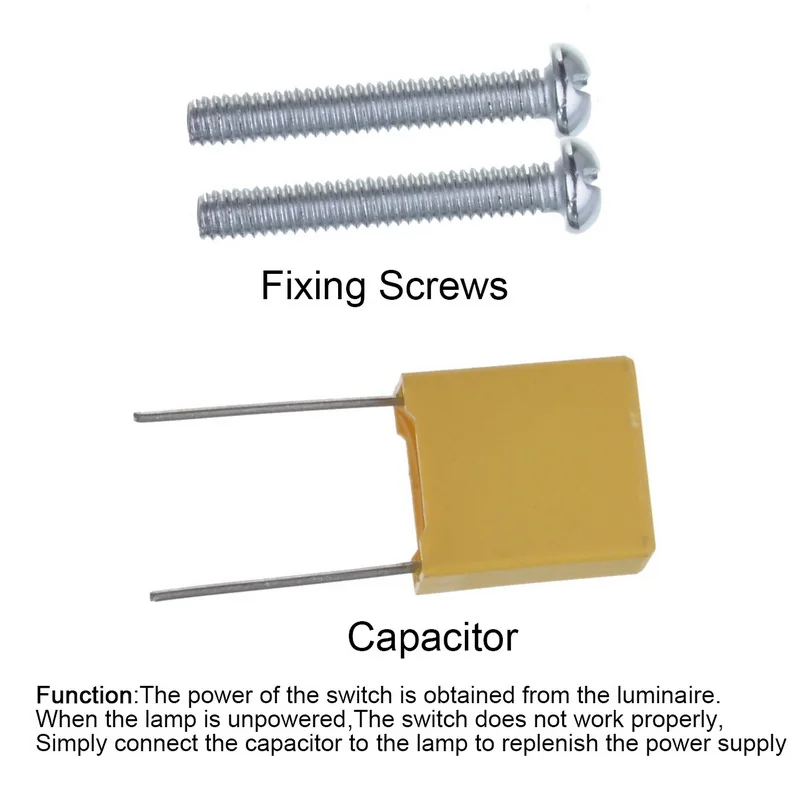 1x ЕС/Великобритания сенсорный экран переключатель, 2x крепежные винты, 1x конденсатор, 1x руководство.