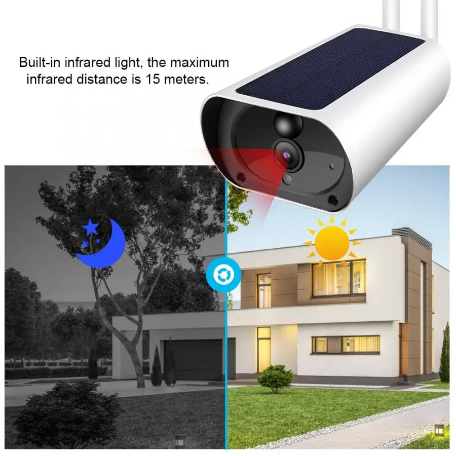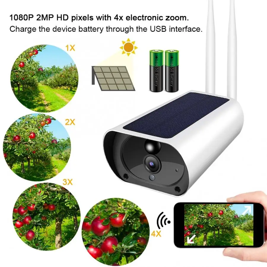 1080P 2MP HD пикселей с 4-кратным электронным зумом. Можно установить 4*18650 батареи, увеличивая емкость аккумулятора. Солнечная камера может продолжать работать в дождливые дни в заряженном состоянии. Мобильный телефон 4G карта, реализовать беспроводной удаленный мониторинг без сети, подключить мобильный телефон карта может быть использована (различные национальные Диапазоны частот отличаются). Встроенный инфракрасный светильник, максимальное инфракрасное расстояние 15 метров. Включите Интеллектуальное обнаружение движения для обнаружения движущихся объектов и отправки сообщений тревоги в мобильное приложение. Пыленепроницаемый и непромокаемый IP67, изготовлен из алюминиевого сплава и инженерного пластикового материала, с хорошей теплоотдачей, эффективно предотвращающей проникновение пыли и брызг дождя. После вставки карты памяти вы можете начать запись. Максимальная поддержка 128 ГБ. Когда карта заполнена, видео будет автоматически перезаписано без ручного удаления видео.