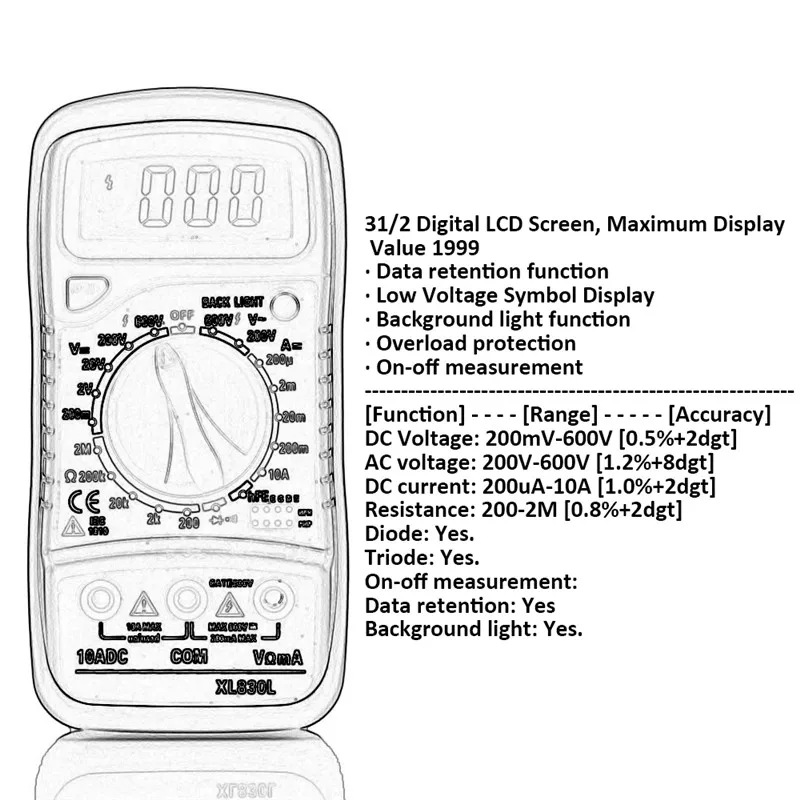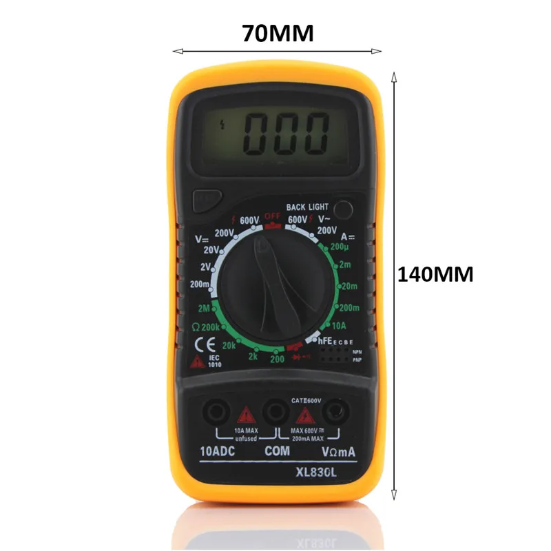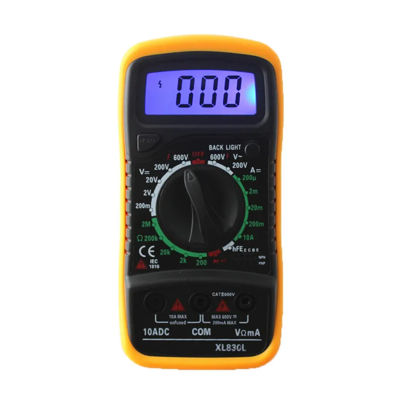 Высокое качество 100% новый. Цифровой мультиметр-практичный инструмент для использования электриком. Легко работать и показания, указанные непосредственно на экране. Его можно использовать для ремонта всех видов монтажных плат. Это также идеальный инструмент обучения для студентов. 15 мм высокий ЖК-дисплей. Максимальный дисплей: 1999, автоматический дисплей полярности. Портативный и компактный дизайн, защита от перегрузки на всех диапазонах. Тест на сборку диодов/транзистор P-N тест на соединение/Высокочастотный транзистор тест. Проверка непрерывности с звуковой сигнал в цепи. Индикация низкого напряжения батареи. DC Напряжение: 200mV/2 в/20 в/200 V ±0. 5%, 600 V ±0. 8%. Напряжение переменного тока: 200 В/600 В ± 1. 2%. Ток постоянного тока: 200мкм/2ма/20мА ± 1%, 200мА ± 1. 5%, 10А ± 3%. Сопротивление: 200ω/2Kω/20Kω/200Kω/2Mω ±0. 8%. Защита предохранителя: F-200mA/250 В. Рабочая температура: от-0 до 40. Индикация избыточного диапазона: только рисунок "1" на дисплее. Индикация полярности: "-" отображается для отрицательной полярности. Низкая индикация батареи:-/+ дисплей. Батарея: 9 В (батарея не включена). Размеры: около 138 мм x 69 мм x 31 мм. # Батарея не будет включена в доставку, потому что новые правила воздушной почты. Посылка в комплекте 1 х ЖК-цифровой мультиметр. 2 х тестовых нагрузки. 1 х оранжевая задняя крышка. 1 х Руководство пользователя на английском языке.