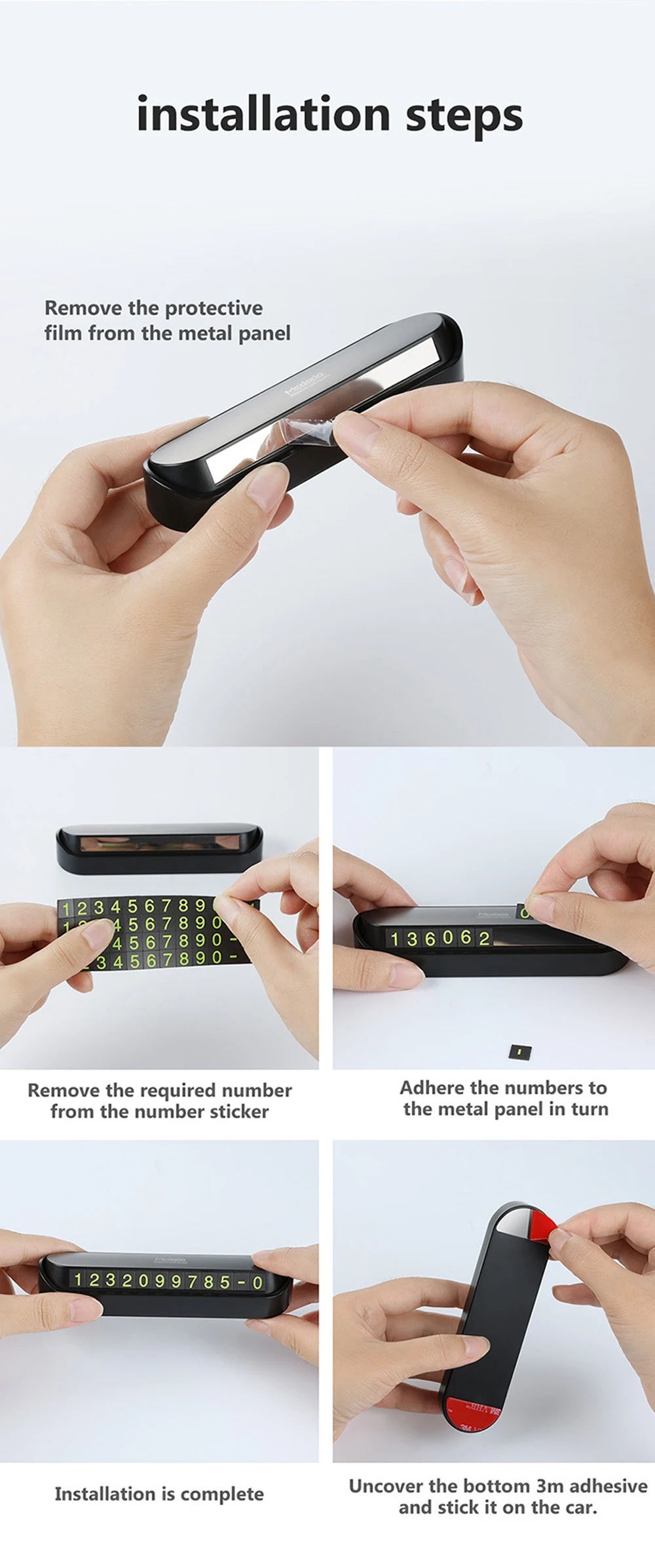 Особенности: 1. Нажмите, чтобы изменить номер: одним нажатием вы можете переключить дисплей и скрыть номер за одну секунду, что может защитить конфиденциальность владельца. 2. Материал защиты окружающей среды ABS: Использование материалов защиты окружающей среды ABS, структурная стабильность, защита от солнца, высокая температура, прочный, не легко деформируется. 3. Изысканный и компактный: очень тонкий и замечательный, маленький корпус, не будет блокировать линию зрения; Гладкая форма тела и красивая дуга, и случайный матч с вашим автомобилем. 4. Дизайн номерной пластины ящика: есть 10 групп (0-9) магнитных наклеек, вы можете свободно создать свой собственный мобильный телефон. Инструкции по использованию: 1. Используйте разборку, вставленную здесь, откройте номер офиса. 2. Поместите номера мобильных телефонов в зажим, и номера могут быть непосредственно под рукой. 3. Вы можете отрезать/выключить карту. Параметры: Тип: временные парковочные карты Материал: PC + ABS Цвет: черный, серебристый Количество: 1 шт. Размеры: 13*3,5*2,6 см Вес: 90 г Посылка: 1 * временные парковочные карты 4 * наборы телефонных номеров от 0 до 9