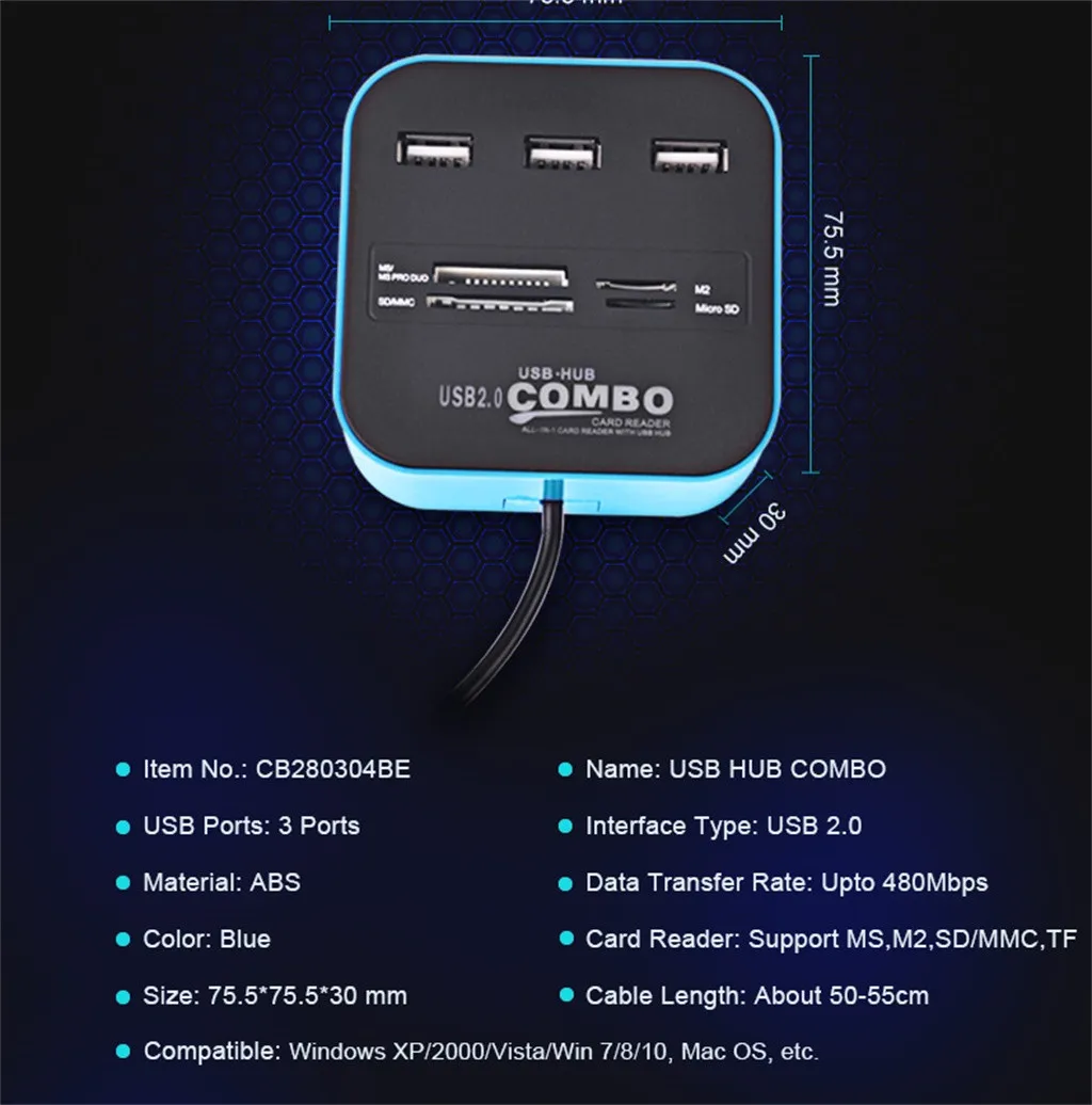 100% новые и высококачественные Устройство USB Hot plug & play 3 порта USB Скорость передачи интерфейса USB 2,0 до 480 Мбит/с Светодиодный индикатор состояния питания Поддержка карт памяти MS, M2, SD / MMC, TF Бесплатный считыватель, поддерживает Windows XP / 2000 / Vista / WIN 7/8/10, MacOS OS, И так далее Технические характеристики: