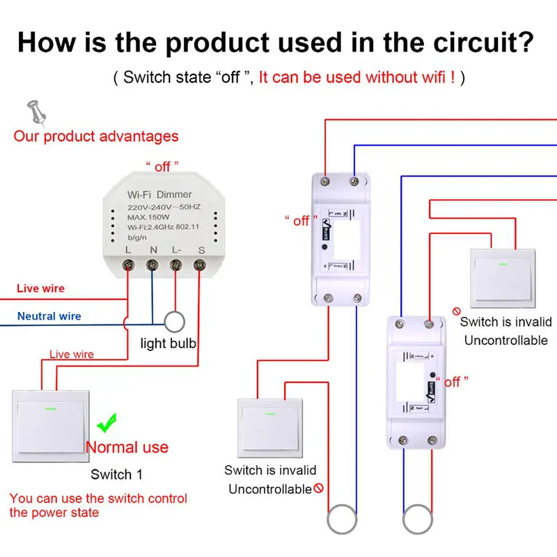 Диммерный модуль Wi-Fi предназначен для преобразования традиционного переключателя (кнопочный переключатель) в переключатель Wi-Fi, который позволяет подключенному устройству управлять через смартфон, а также традиционный переключатель.