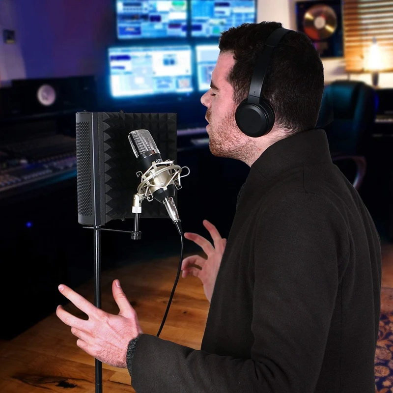 Складной и регулируемый. Он может быть установлен на подставке для микрофона в вертикальном положении или стреле.