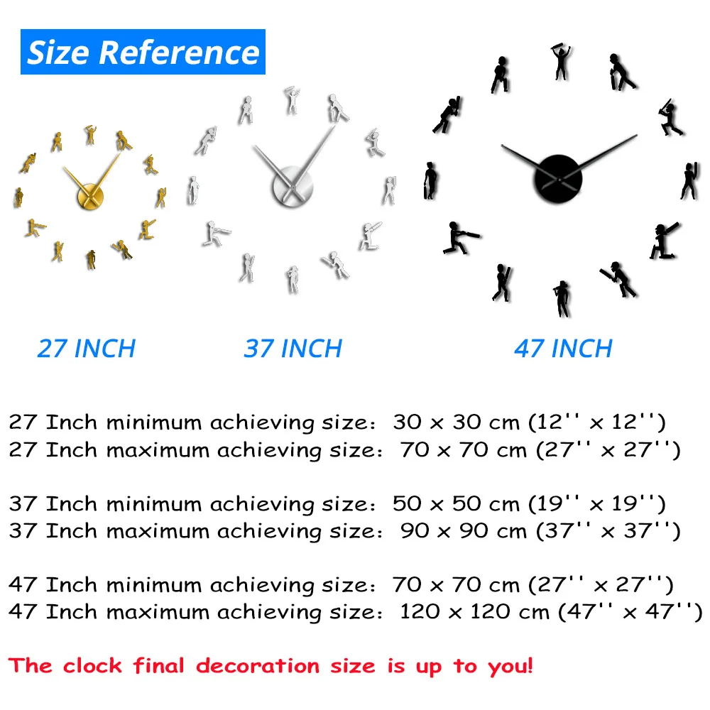 Размер отделки часов основан на ваших предпочтениях, чтобы украсить вашу стену. Часовая длина руки -27 дюймов: 13,5 см (5,3 '') -37 дюймов: 23,5 см (9,25 ") -47 дюймов сенсорный экран: 31,5 см (12,5 '') Минутная длина руки -27 дюймов: 19,5 см (7,6 '') -37 дюймов: 31,5 см (12,4 '') -47 дюймов сенсорный экран: 39 см (15,4 '') Минимальное достижение -27 дюймов: 30x30 см (12 ''x 12'') -37 дюймов: 50x50 см (19 ''x 19'') -47 дюймов: 70x70 см (27 ''x 27'') Максимальное достижение -27 дюймов: 70x70 см (27 ''x 27'') -37 дюймов: 90x90 см (37 ''x 37'') -47 дюймов: 120x120 см (47 ''x 47'')