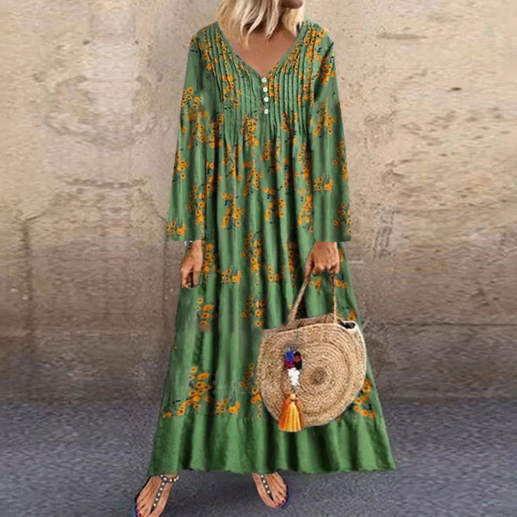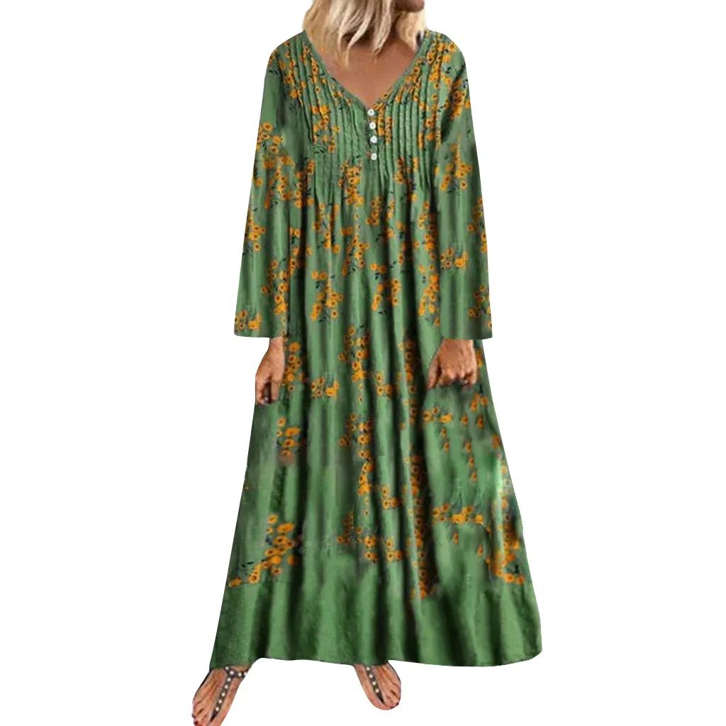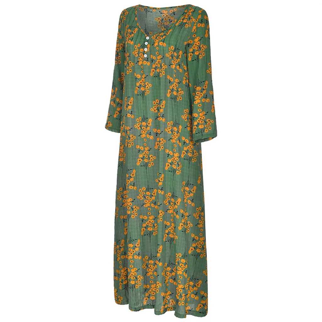 Женское платье размера плюс с принтом из хлопка и льна с длинным рукавом и круглым вырезом, Длинное Платье Макси