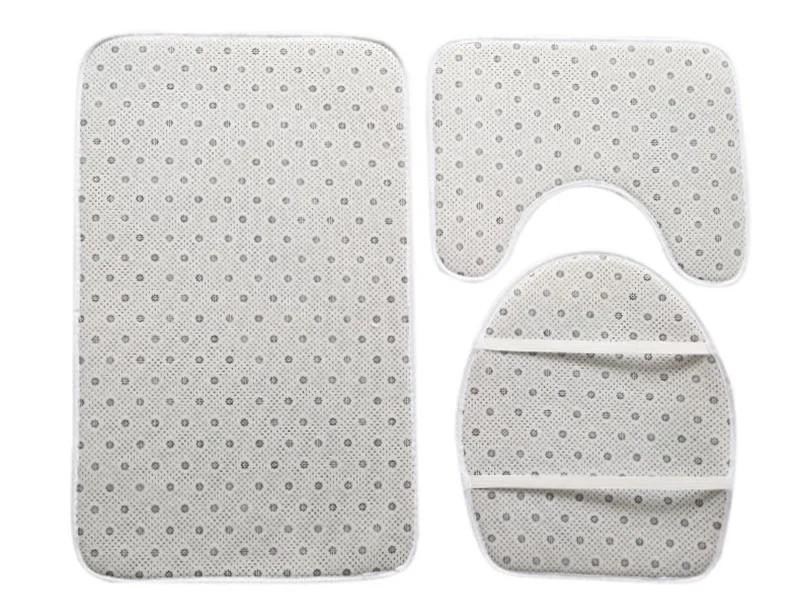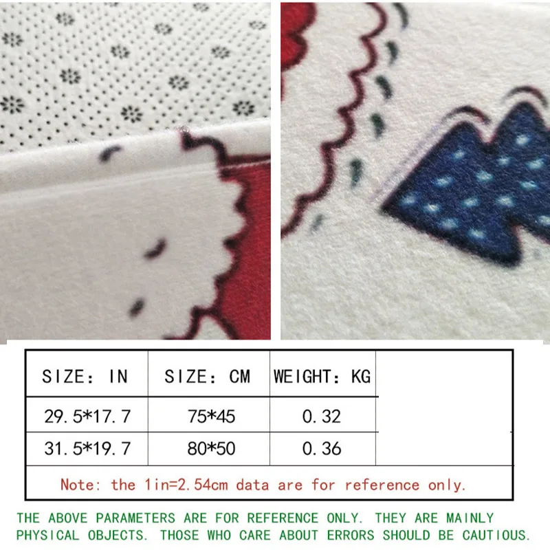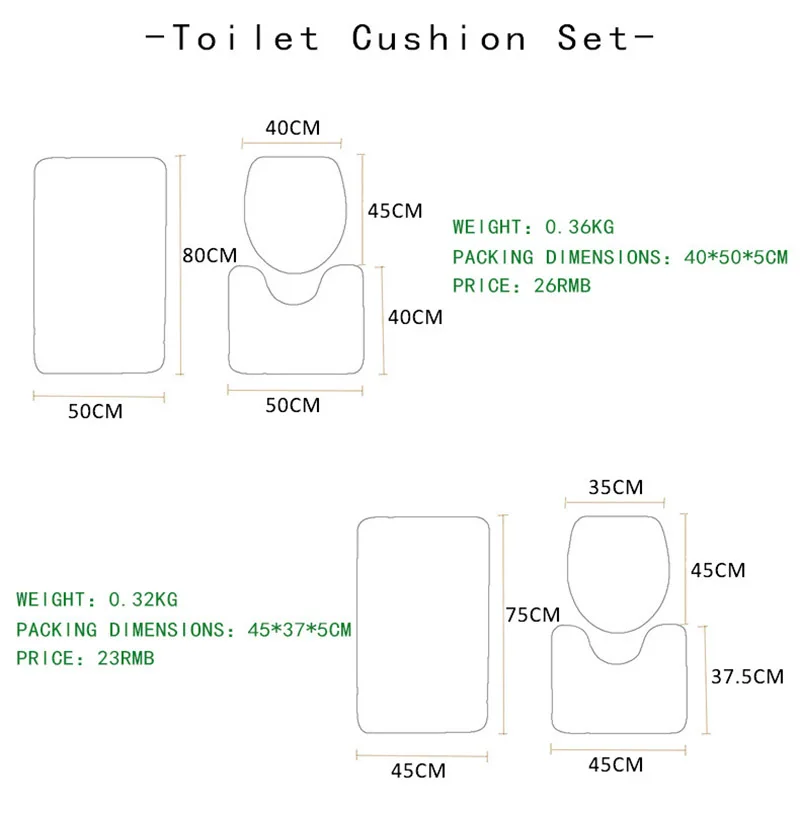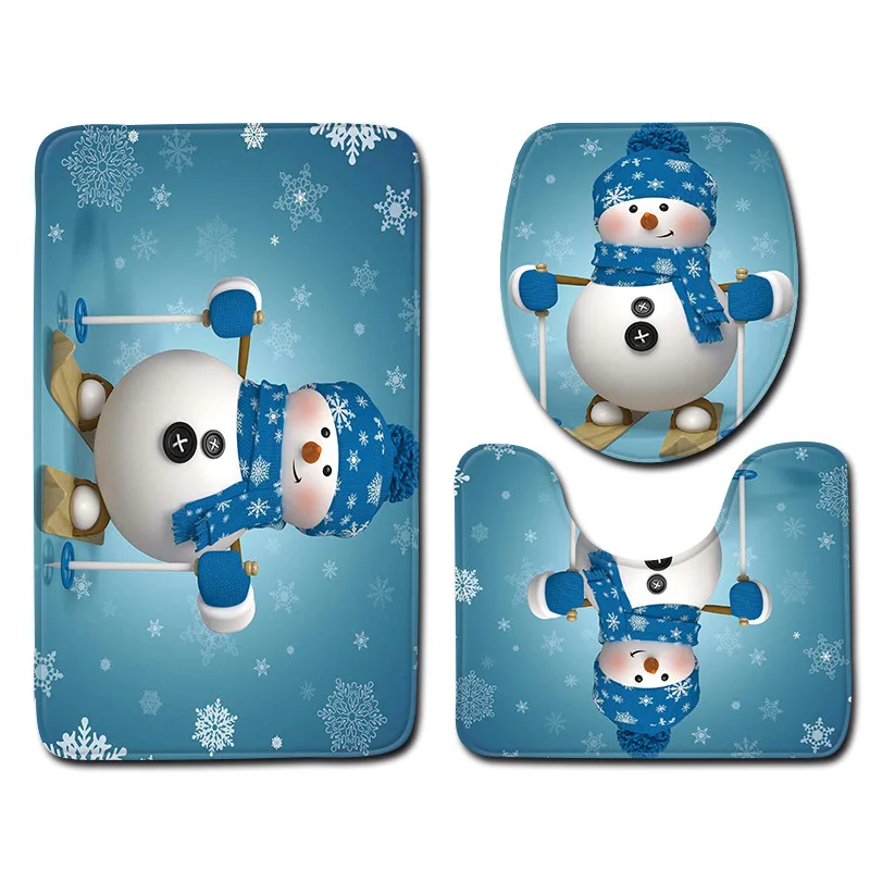 -Material: polyester -Size: as pictures show -Color: Pink, red, white, green, blue. -Theme: Merry Christmas Decoration -Package: 3PCS Bathroom Mats (1xFloor mat; 1x U shape pad: 1x Toilet lid Cover)