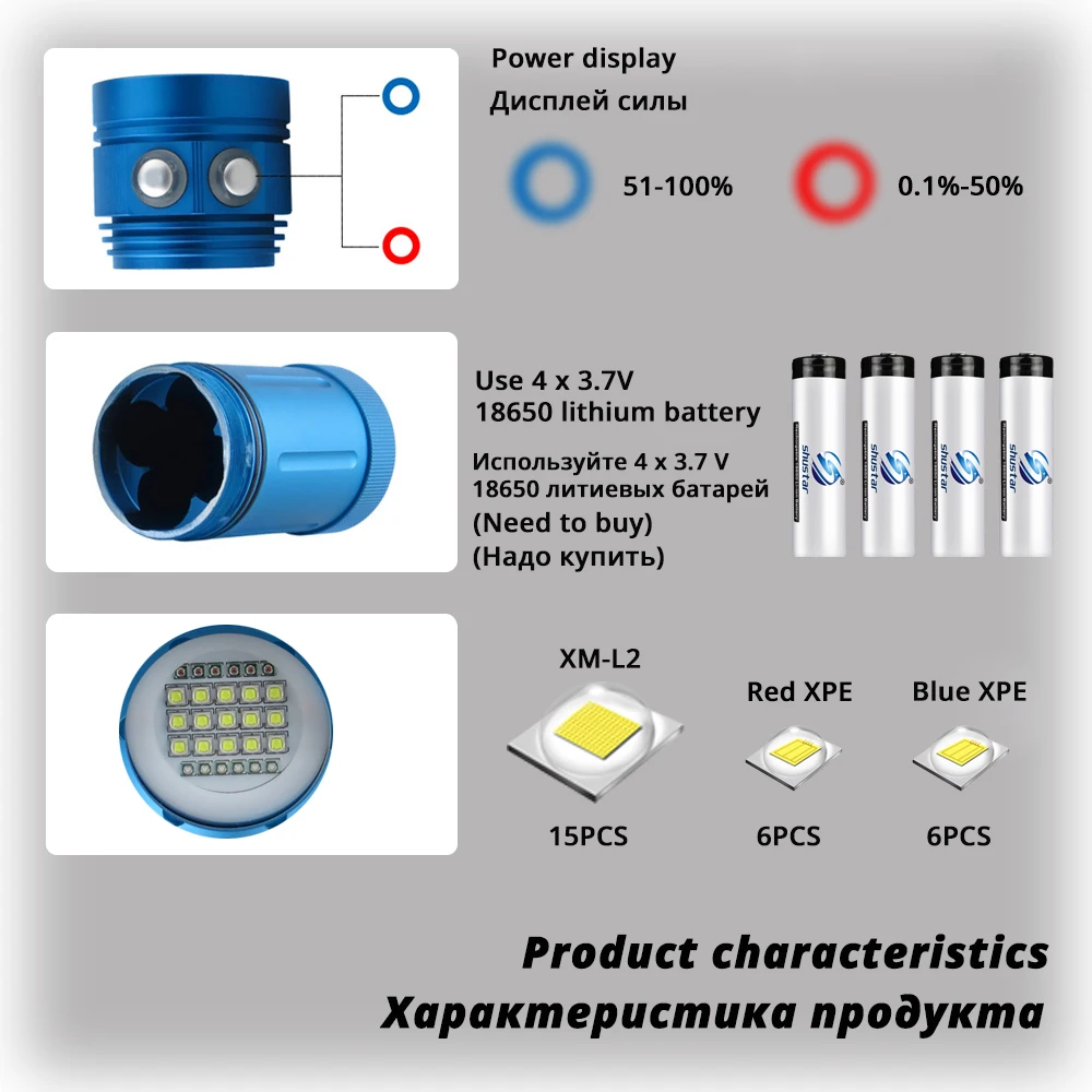 1. Профессиональный подводный светильник для фотосъемки, используя высококачественный белый светильник XM-L2 лампами + красный светильник XPE + синий светильник XPE, позвольте вам в темноте под водой, как белый, лучший выбор для дайверов.