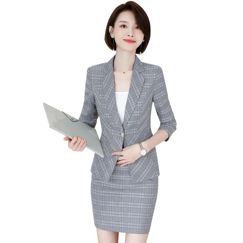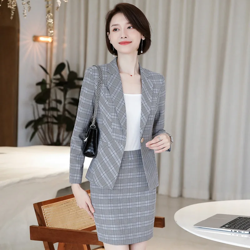 Профессиональный комплект с юбкой, большой размер, S-4XL, Осень-зима, новый тонкий клетчатый блейзер с длинными рукавами, офисный женский костюм, высокое качество