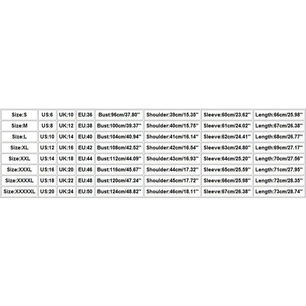 Пожалуйста, сравните размеры с вашими перед покупкой! Цвета могут немного отличаться в зависимости от настроек компьютера и монитора Пожалуйста, позвольте 1-3 см отличаться из-за ручного измерения, спасибо (все измерения в см и пожалуйста, обратите внимание на 1 см = 0,39 дюйма) Размеры таблицей:Размер Свяжитесь с нами Великобритания ЕС Обхват груди Сумка на плечо Рукава Длина S 6 10 36 96 см/37,80'' 39 см/15,35'' 60 см/23,62'' 66 см/25,98'' М 8 12 38 100 см/39,37'' 40 см/15,75'' 61 см/24,02'' 67 см/26,38'' L 10 14 40 104 см/40,94'' 41 см/16,14'' 62 см/24,41'' 68 см/26,77'' XL 12 16 42 108 см/42,52'' 42 см/16,54'' 63 см/24,80'' 69 см/27,17'' XXL 14 18 44 112 см/44,09'' 43 см для ухода за ребенком для мам/16,93'' Высота голенища 64 см; 25,20'' 70 см/27,56'' XХХL 16 20 46 116 см/45,67'' 44 см/17,32'' 65 см/25,59'' 71 см/27,95'' XXXXL 18 22 48 120 см/47,24'' 45 см/17,72'' 66 см/25,98'' 72 см/28,35'' XXXXXL 20 24 50 124 см/48,82'' 46 см/18,11'' 67 см/26,38'' 73 см/28,74''