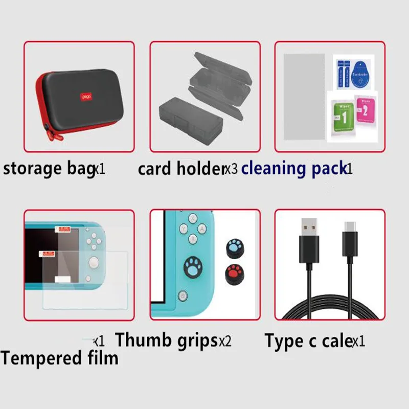 1. Сумка для nintendo switch Lite: может хранить консоль, игровые карты, зарядный кабель и другие аксессуары. 2. С 3 шт контейнер для хранения карточек 3. С зарядным кабелем type-C 4. С закаленным протектором экрана 5. С аналоговый стик Шапки