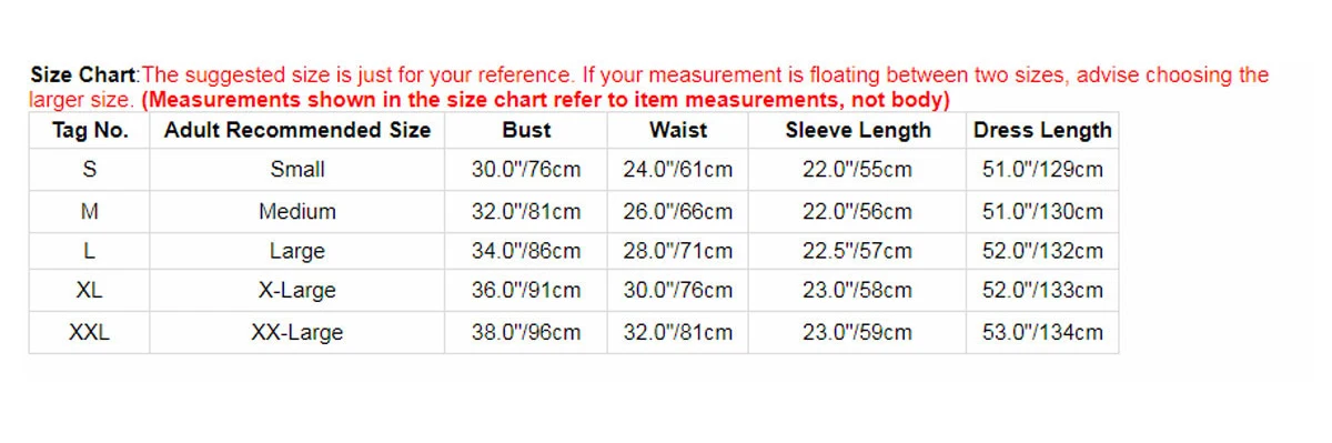 Размер на бирке. Взрослый рекомендуется Размеры Обхват груди Обхват талии Рукав Длина Платье Длина S Маленький 30,0 "/76 см 24,0 "/61 см 22,0 "/55 см 51,0 "/129 см М Средний размер 32,0 "/81 см 26,0 "/66 см 22,0 "/56 см 51,0 "/130 см L Большой 34,0 "/86 см 28,0 "/71 см 22,5 "/57 см 52,0 "/132 см XL X-большой 36,0 "/91 см 30,0 "/76 см 23,0 "/58 см 52,0 "/133 см XXL Xx-большой 38,0 "/96 см 32,0 "/81 см 23,0 "/59 см 53,0 "/134 смПолезные советы: Замеры делаются вручную, поэтому учитывайте небольшие погрешности. Цвет на фото может немного отличаться от реального товара из-за особенностей цветопередачи различных мониторов.