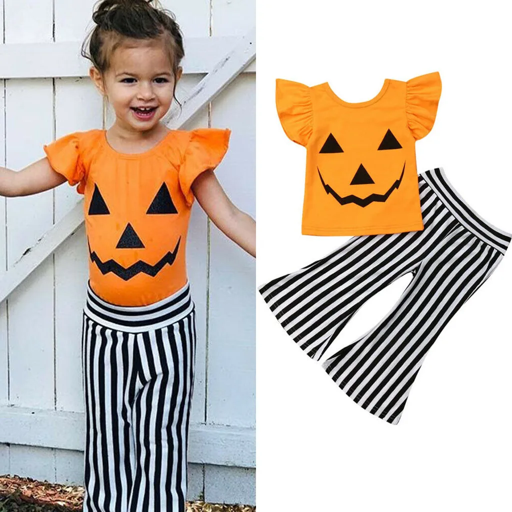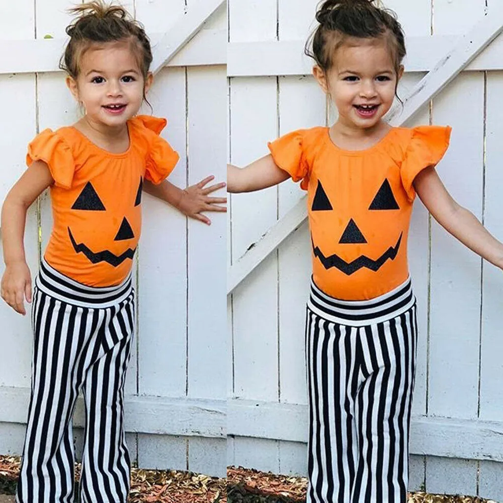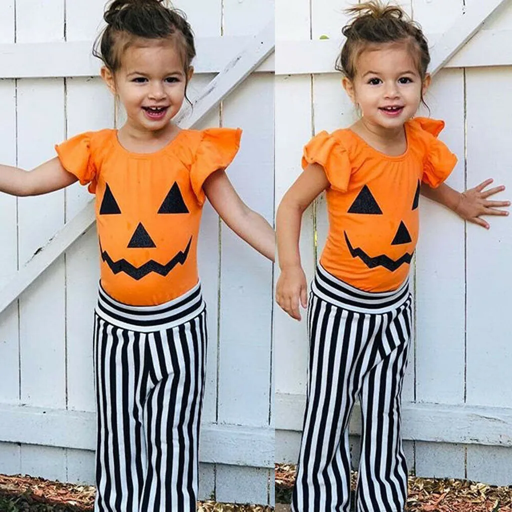 Детская футболка с тыквой на Хэллоуин для маленьких девочек + штаны в полоску; Эксклюзивная одежда для малышей; roupas infantis menina