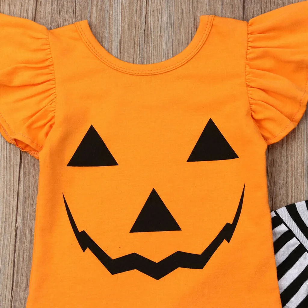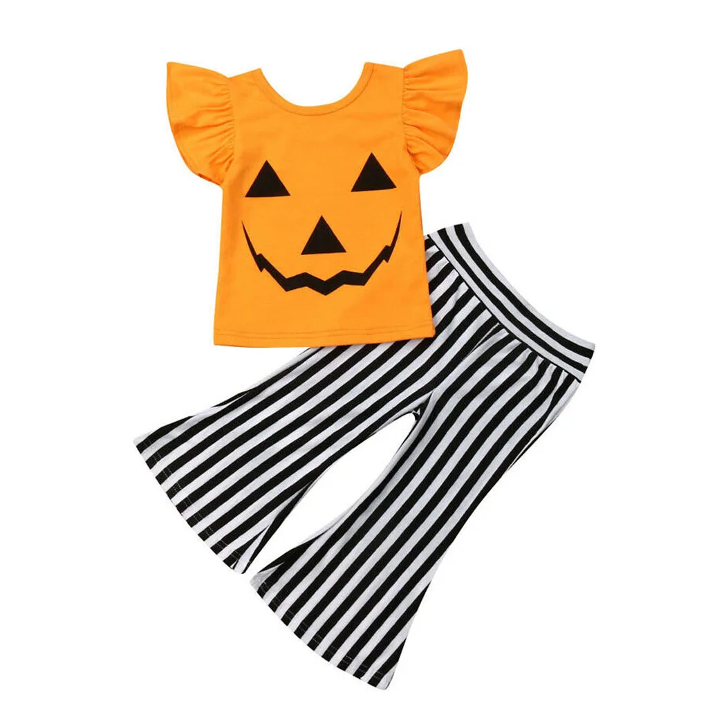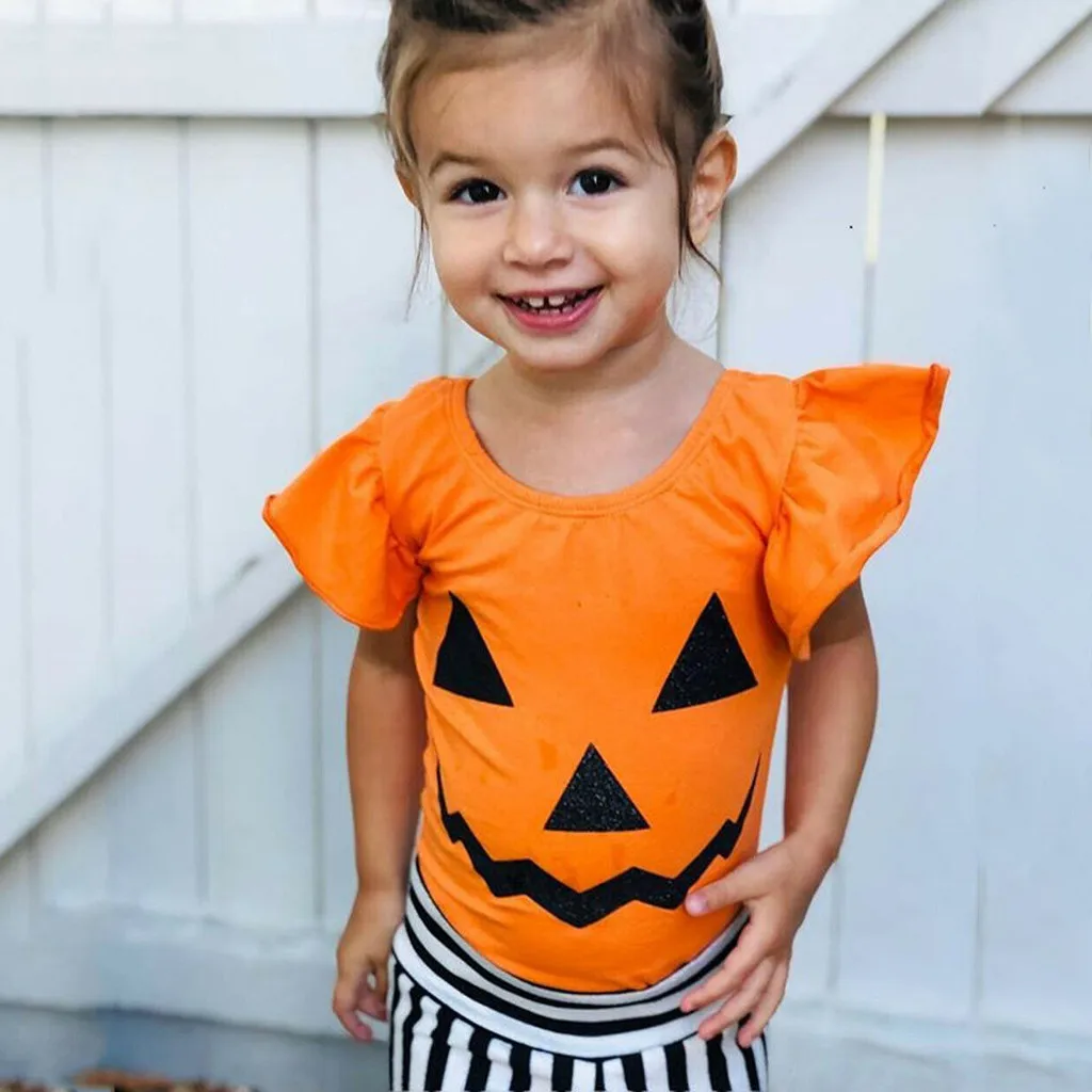 Детская футболка с тыквой на Хэллоуин для маленьких девочек + штаны в полоску; Эксклюзивная одежда для малышей; roupas infantis menina