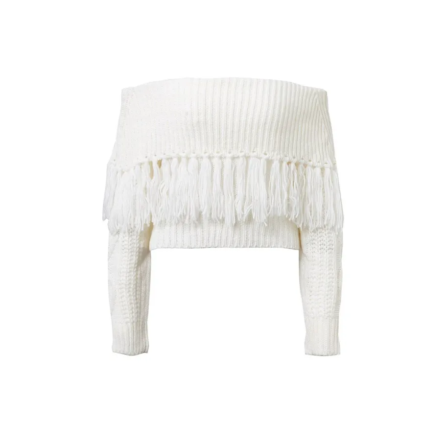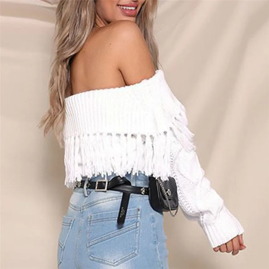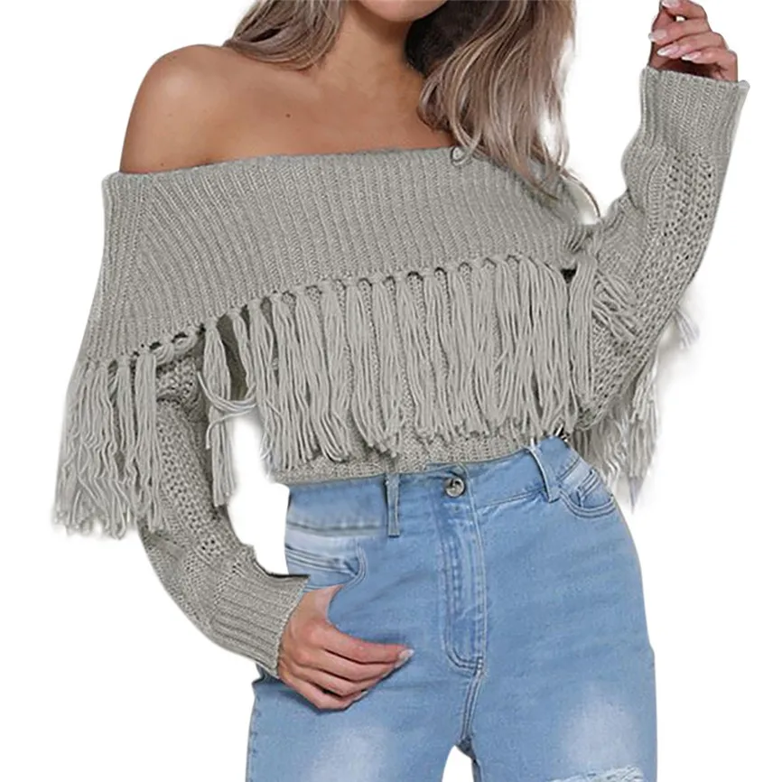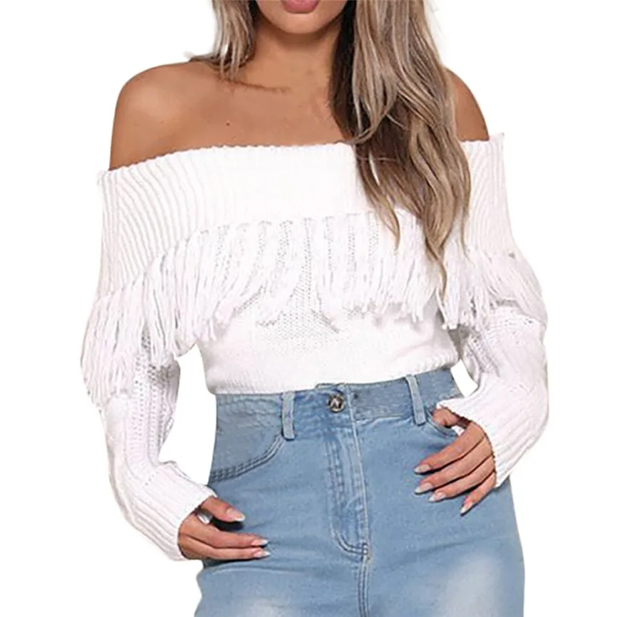Женские сексуальные однотонные с открытыми плечами с кисточками с длинным рукавом свободные свитера блузки Топы