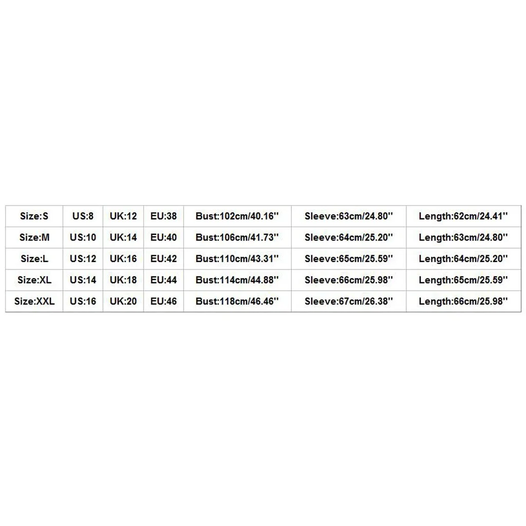Обратите внимание что небольшая разница в цвете считается приемлемой. Это может быть связано с положением источника света и с настройками экрана. Размер США Великобритания ЕС Бюст Рукав Длина S 8 12 38 102 см/40,16'' 63 см/24,80'' 62 см/24,41'' М 10 14 40 106 см/41,73'' 64 см/25,20'' 63 см/24,80'' L 12 16 42 110 см/43,31'' 65 см/25,59'' 64 см/25,20'' XL 14 18 44 114 см/44,88'' 66 см/25,98'' 65 см/25,59'' XXL 16 20 46 118 см/46,46'' 67 см/26,38'' 66 см/25,98''