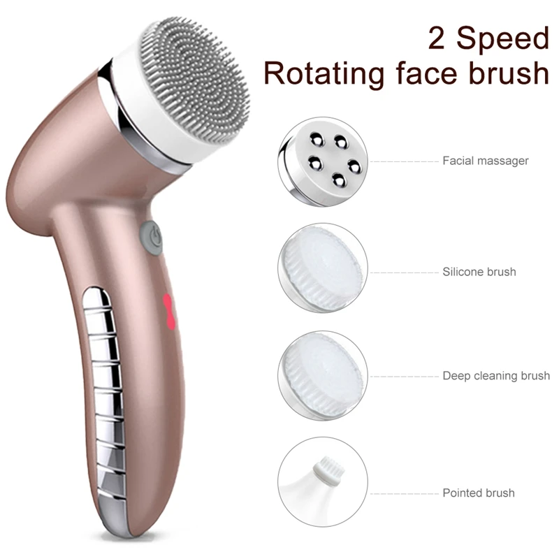 4. Полный спектр вложений. Уникальная металлическая головка идеально подходит для массажа тела и лица и стимуляции кровотока, что делает вашу кожу мгновенно сияющей. Отшелушивающая щетка для очищения лица, силиконовая кисть для лица для ежедневного использования и чувствительной кожи, маленькая силиконовая кисть, чистая для небольшого места на лице. 4 в 1 комплект предоставляет вам различные варианты, которые вы можете настроить любую голову для того чтобы приспособиться к вашей коже.