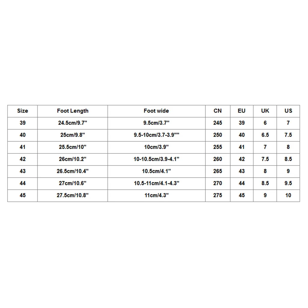 РазмерДлина стопыШирокая стопаCNЕСВеликобританияСША3924,5 см/9,7 дюйма9,5 см/3,7 дюйма24539674025 см/9,8 дюйма9,5-10 см/3,7-3,9 ""250406,57,54125,5 см/10"10 см/3,9"25541784226 см/10,2 дюйма10-10,5 см/3,9-4,1 дюйма260427,58,54326,5 см/10,4 дюйма10,5 см/4,1 дюйма26543894427 см/10,6"10,5-11 см/4,1-4,3 дюйма270448,59,54527,5 см/10,8 дюйма11 см/4,3 дюйма27545910