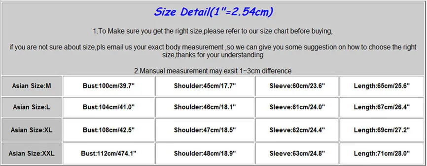 Азиатский Размеры: МОбхват груди: 100См/39,7"Плечо: 45 см/17,7 дюймаРукав: 60 см/23,6 дюймаДлина: 65 см/25,6 дюймаАзиатский Размеры: LОбхват груди: 104 см/41,0"Плечо: 46 см/18,1 дюймаРукав: 61 см/24,0 дюймаДлина: 67 см/26,4 дюймаАзиатский Размеры: XLОбхват груди: 108См/42,5"Плечо: 47 см/18,5 дюймаРукав: 62 см/24,4 дюймаДлина: 69 см/27,2 дюймаАзиатский Размеры: XXLОбхват груди: 112 см/474,1"Плечо: 48 см/18,9 дюймаРукав: 63 см/24,8 дюймаДлина: 71 см/28,0 дюйма